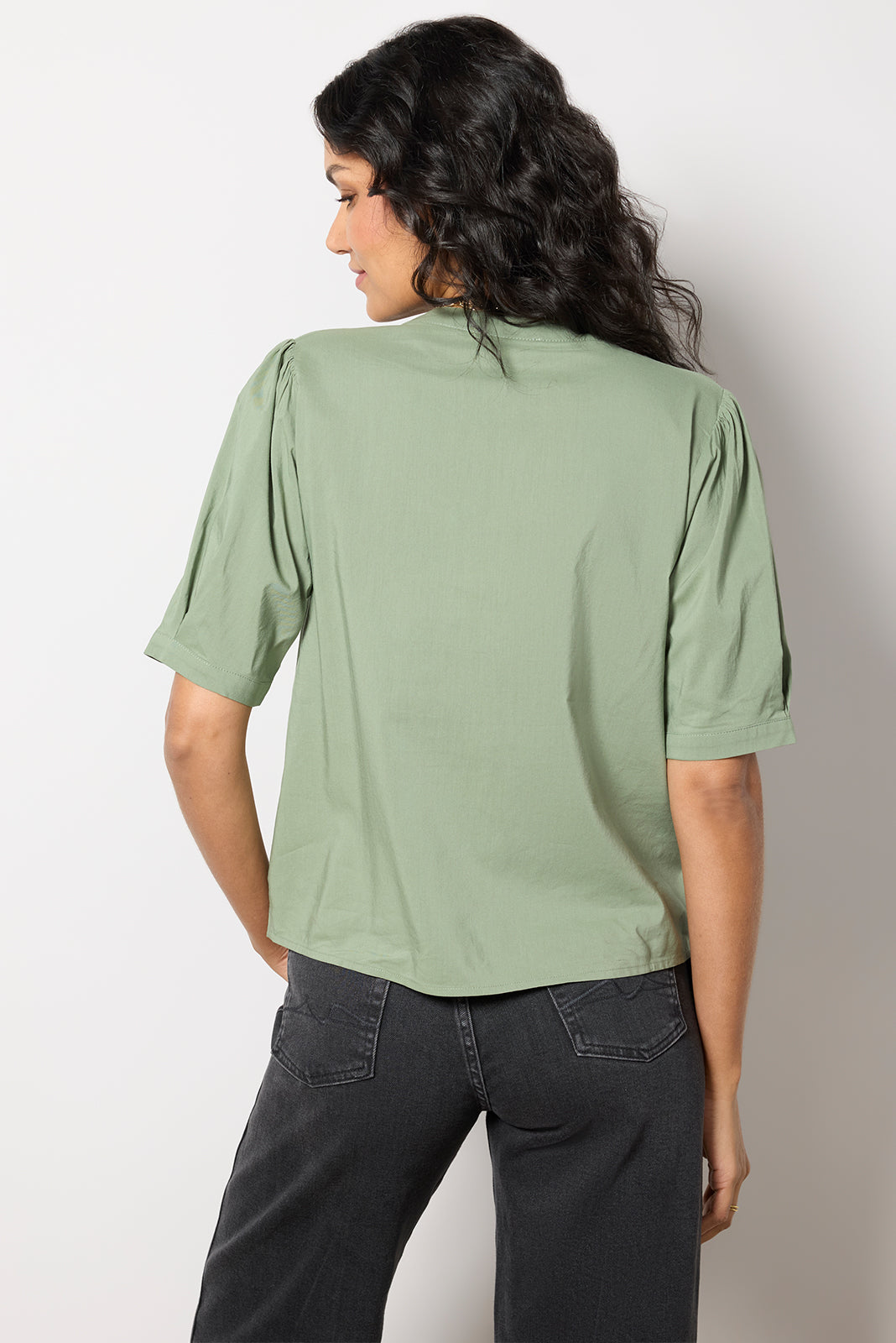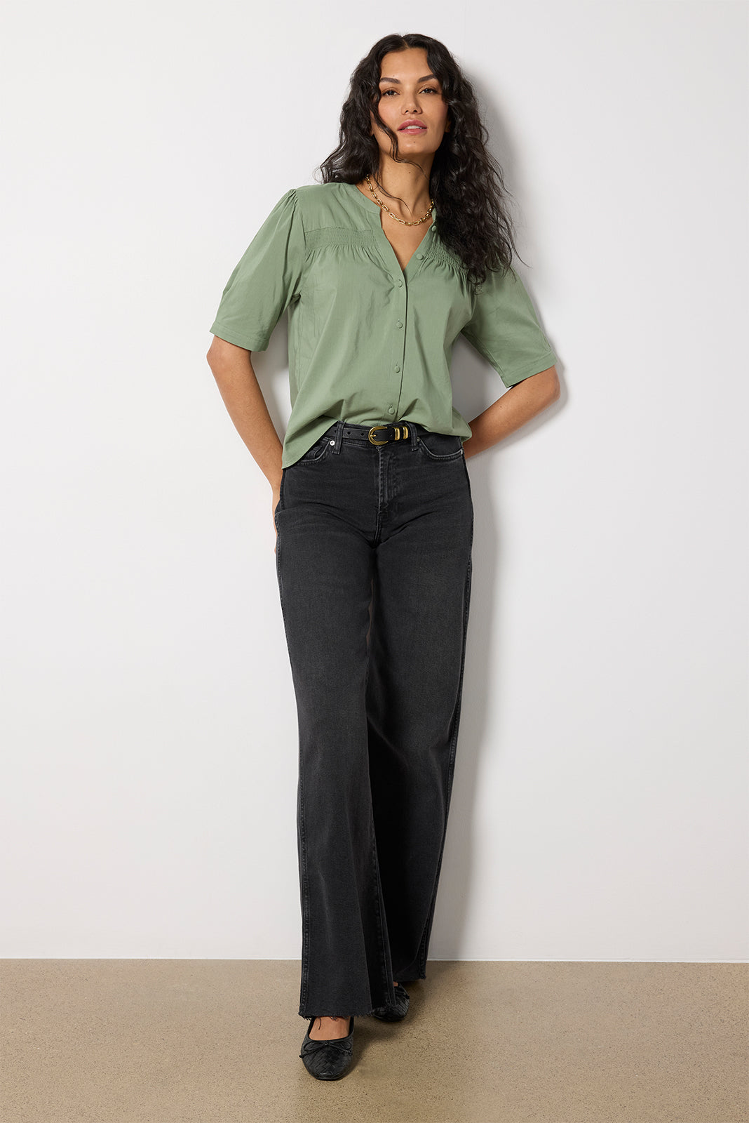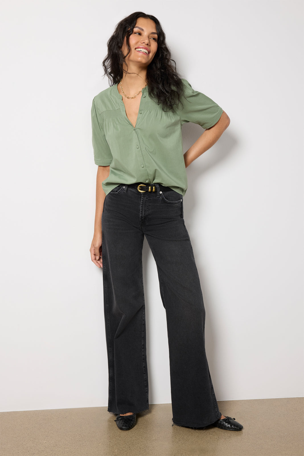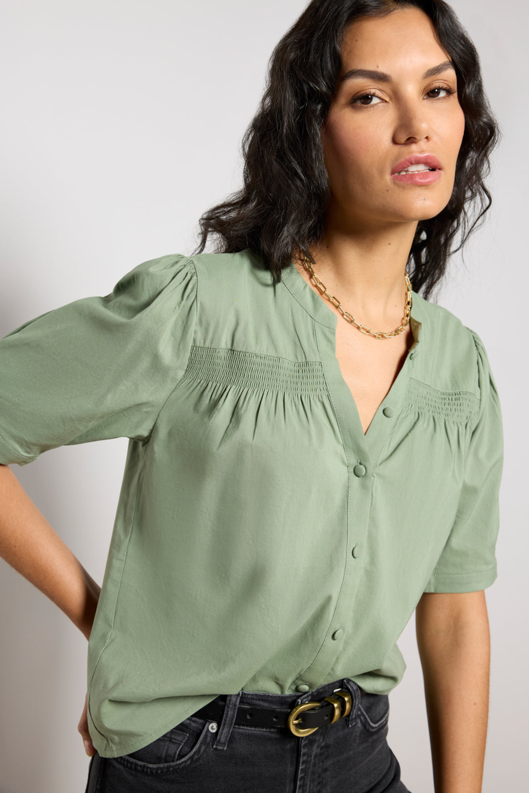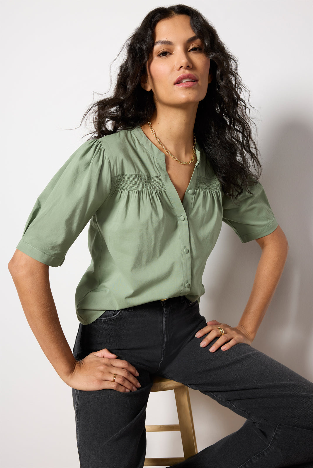Elevate your blouse collection for spring with the Kaia Top by EVEREVE. featuring a split neckline. front button closures. short sleeves with gathering on the shoulder. and gorgeous smocked detailing.?