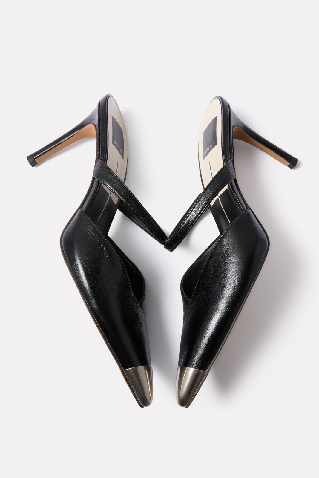 A metal toe cap adds a chic. edgy twist to these stylish Dolce Vita heels. Perfect for any occasion. the Kanika features a slip-on design with a strap detail. pointed toe. and thin tapered heel.