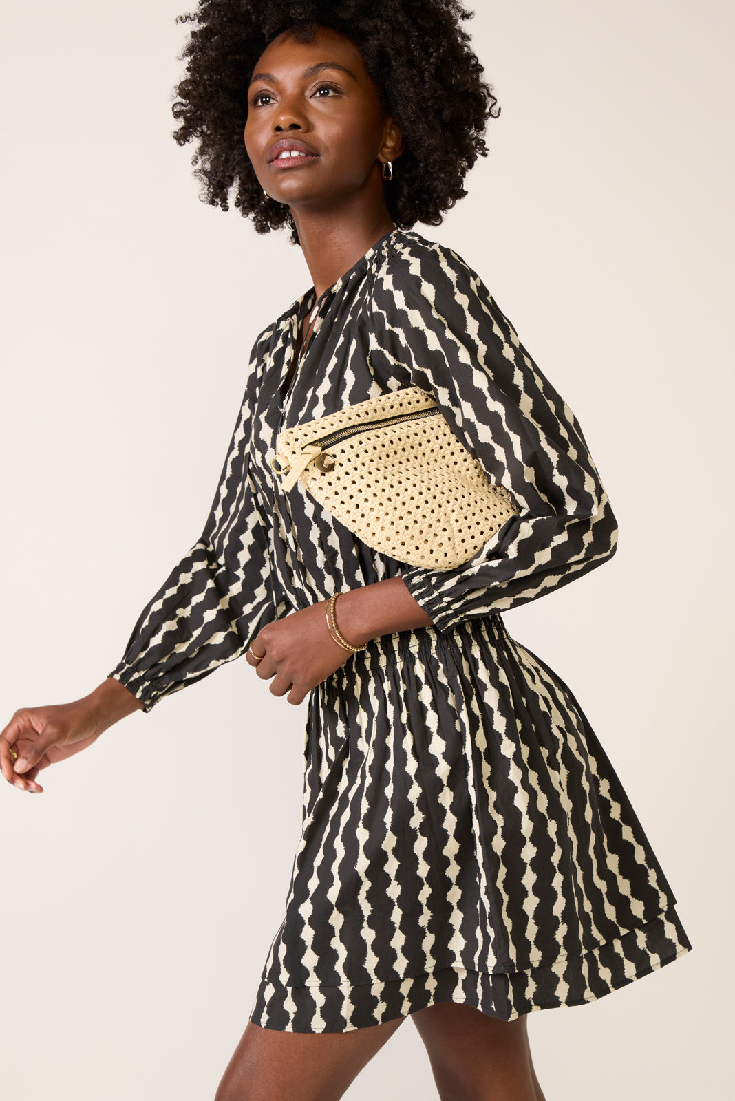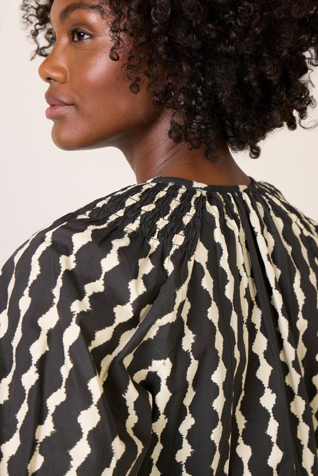Smocking details create a defined waistline on the Kari Mini Dress by Rails. featuring a split neckline. tiered skirt. and long puff sleeves with elastic cuffs.