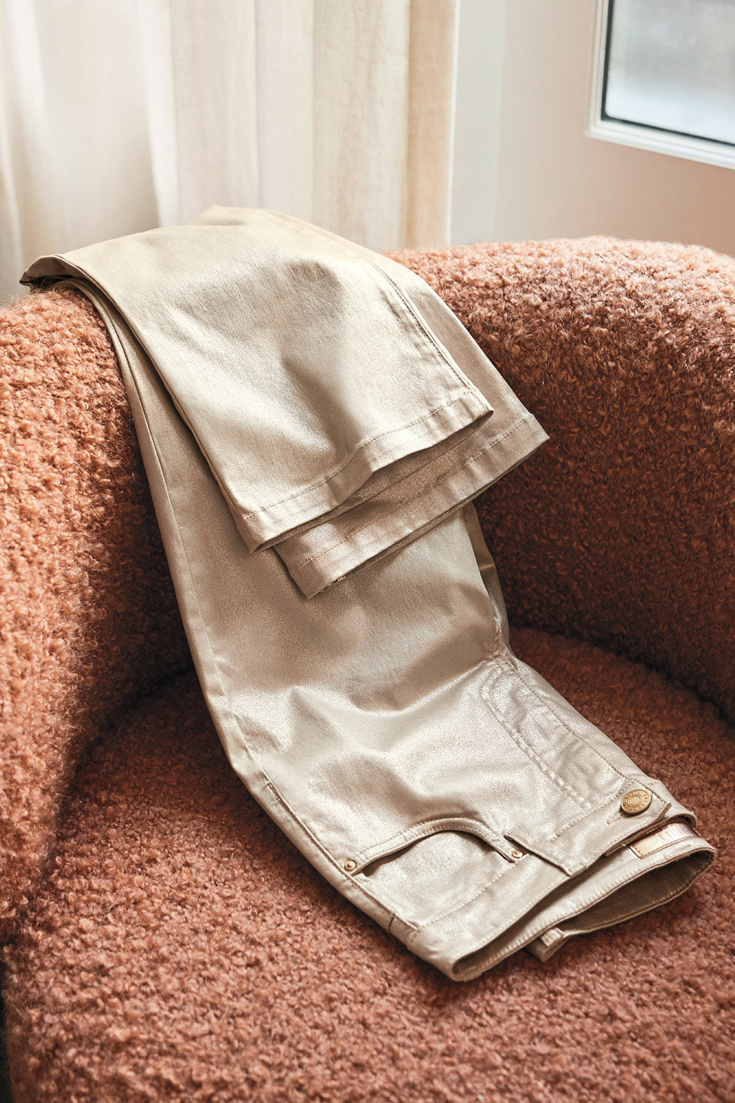 Metallic coated denim puts a chic. seasonal spin on?the Kelsey pants by Kut From The Kloth.?Designed with a flattering bootcut silhouette and ankle-length hems.?these shimmery gold-tone pants are perfect for your fall rotation with sweaters. blouses. and button-downs.