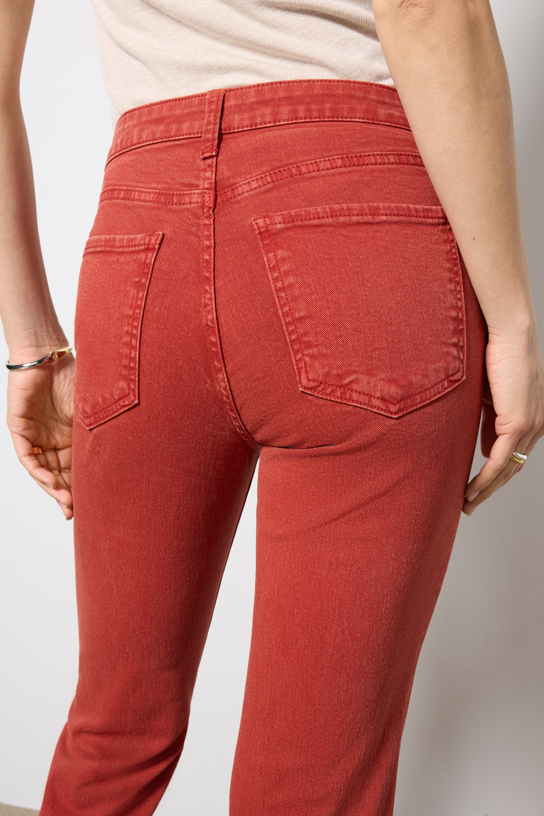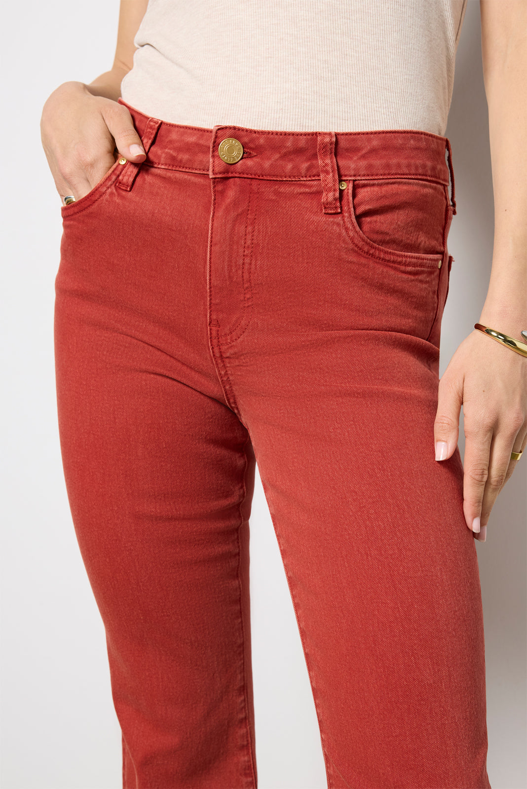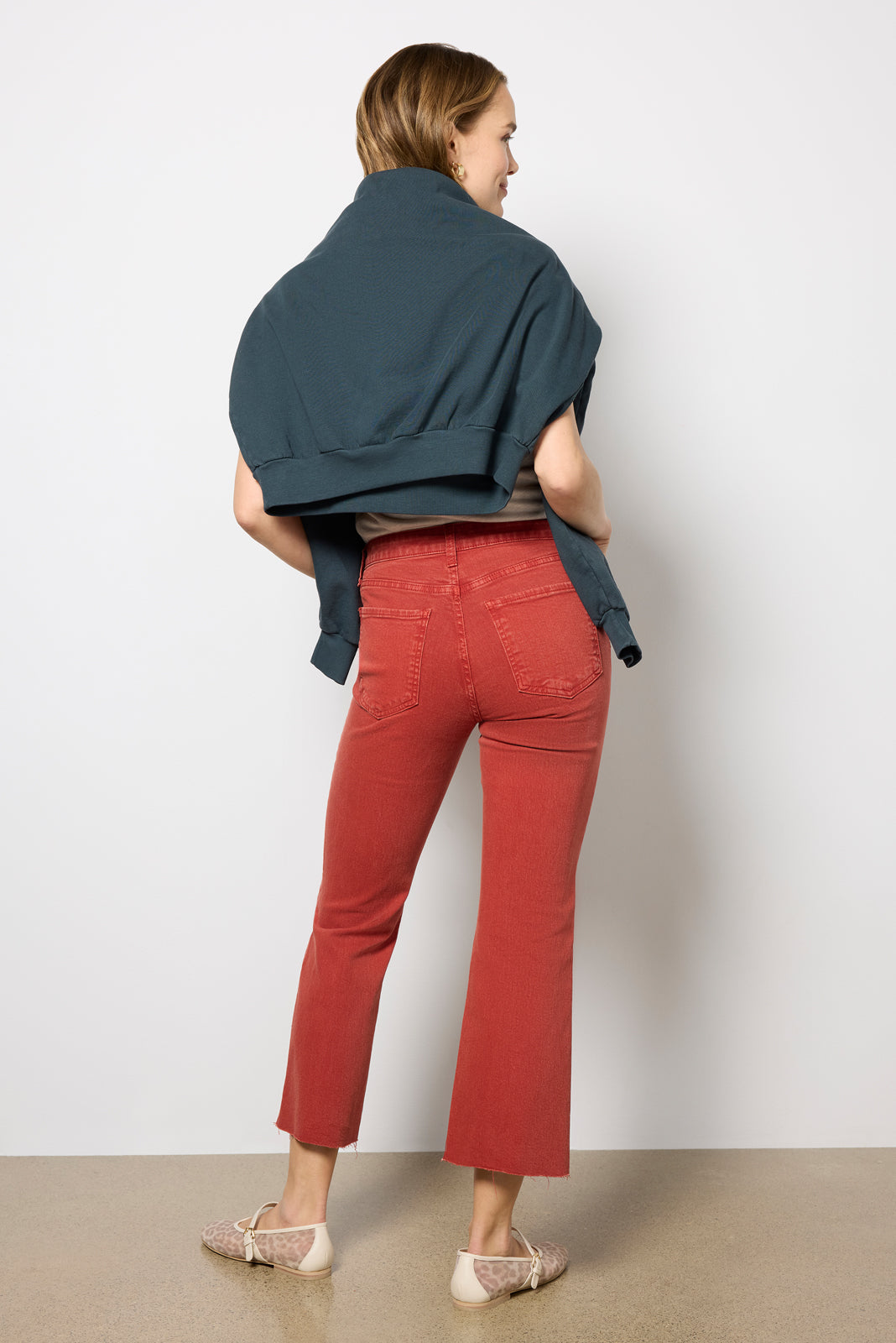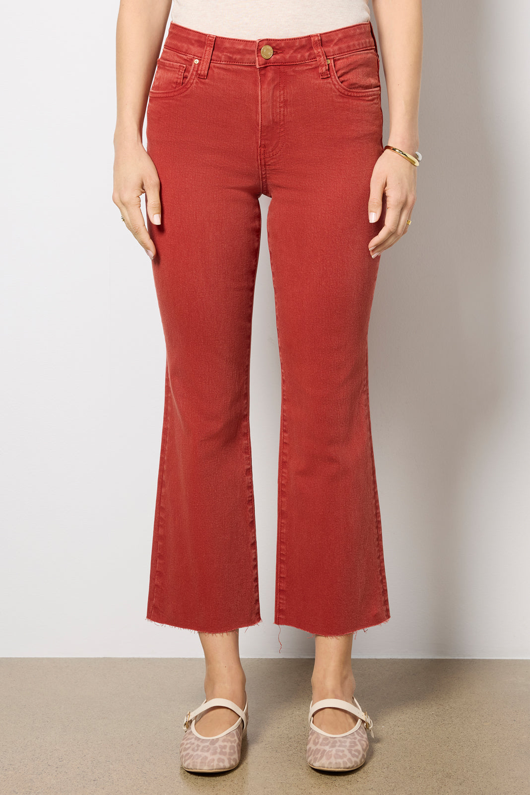 Add a pop of red to your denim collection with the Kelsey Jean by Kut from the Kloth. featuring a mid-rise waist. a flared silhouette. and cropped raw hems.?
