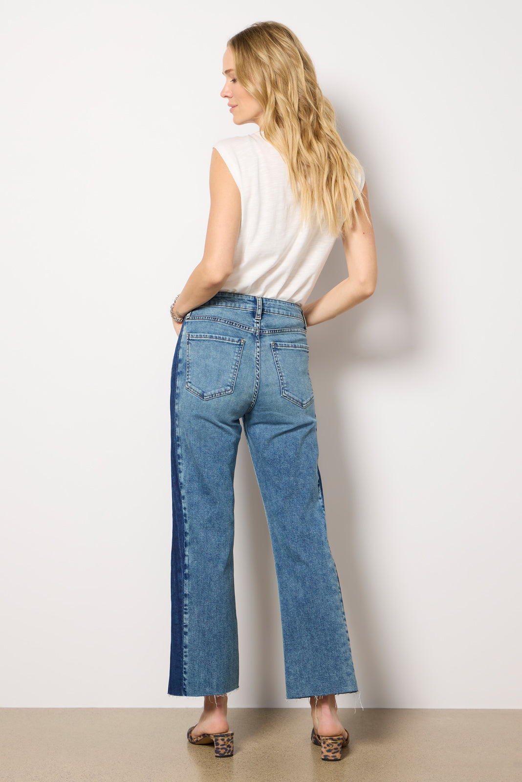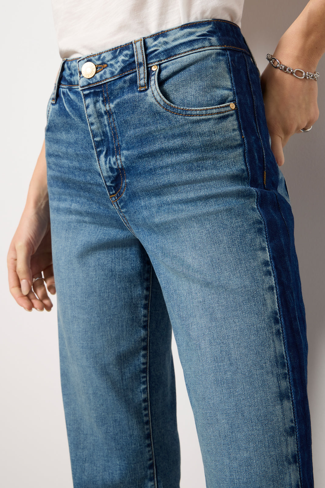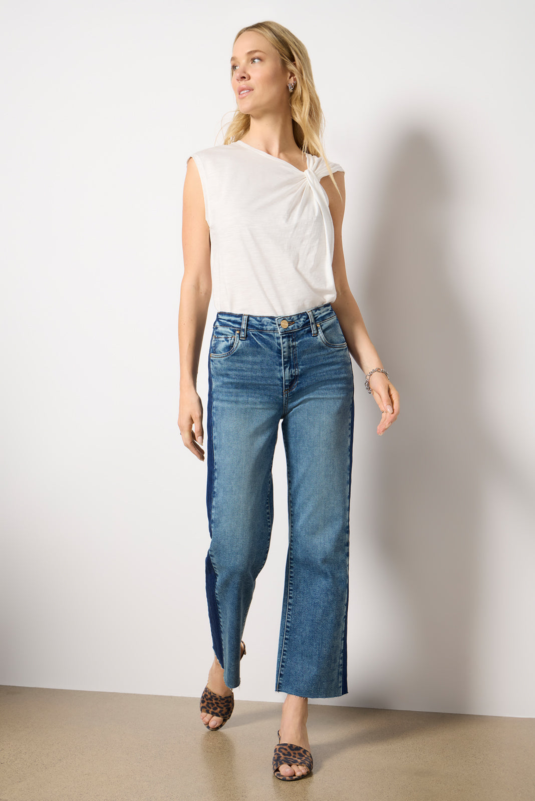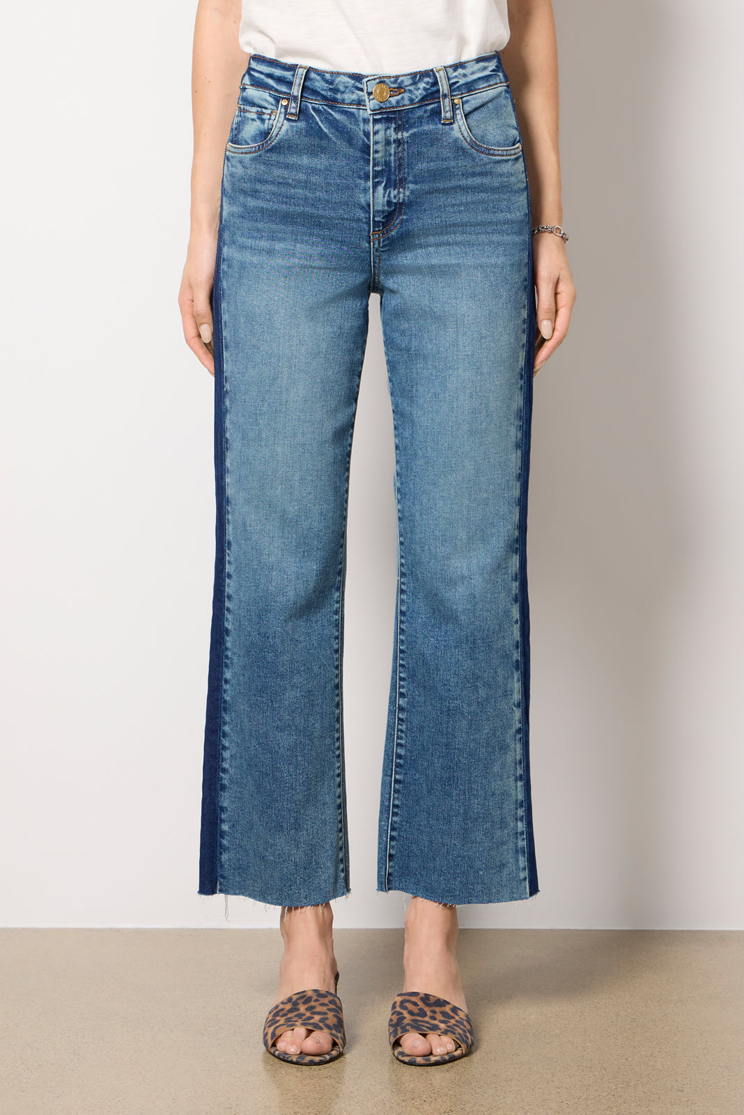 Designed with a contrasting dark wash along the side seams. the Kelsey flare jean by KUT From The Kloth is perfect for day-to-night wear. crafted in comfortable stretch denim with ankle-length raw hems.