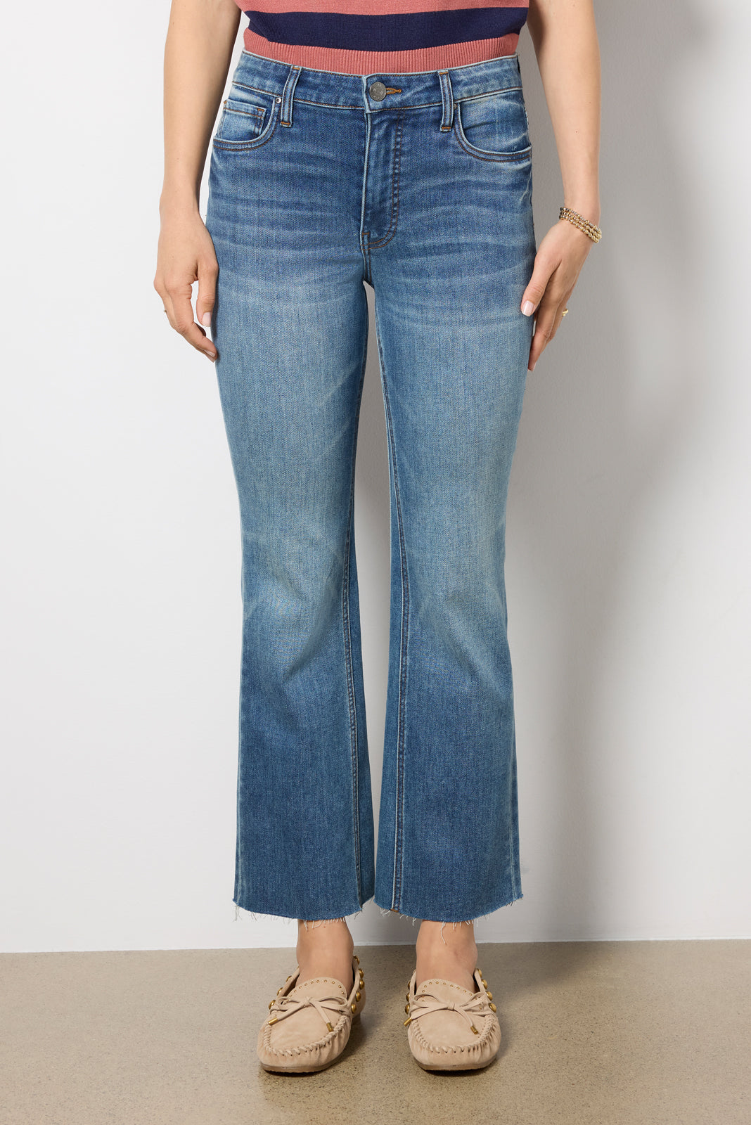 A gently flared leg creates the easy-to-love silhouette of these bootcut jeans by KUT From The Kloth. The Kelsey jean is crafted in soft stretch denim and features a versatile blue wash and ankle-length raw hems.