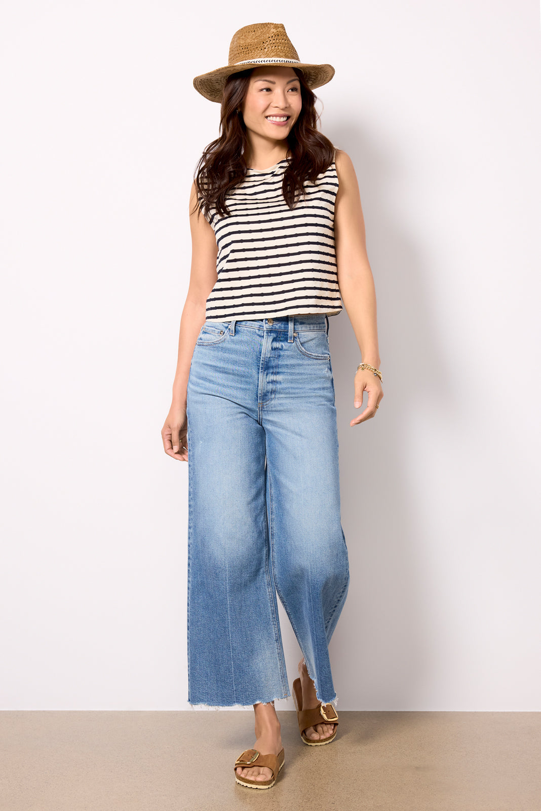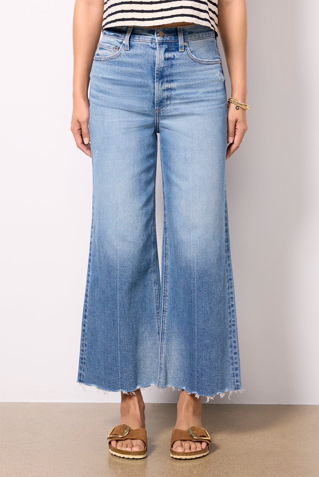 Finished in a versatile blue wash. the Lana jean by Pistola features a wide leg silhouette with a high-rise fit and?raw hems cropped at the ankle. The soft cotton denim has a hint of stretch. making them perfect for day-to-night wear.