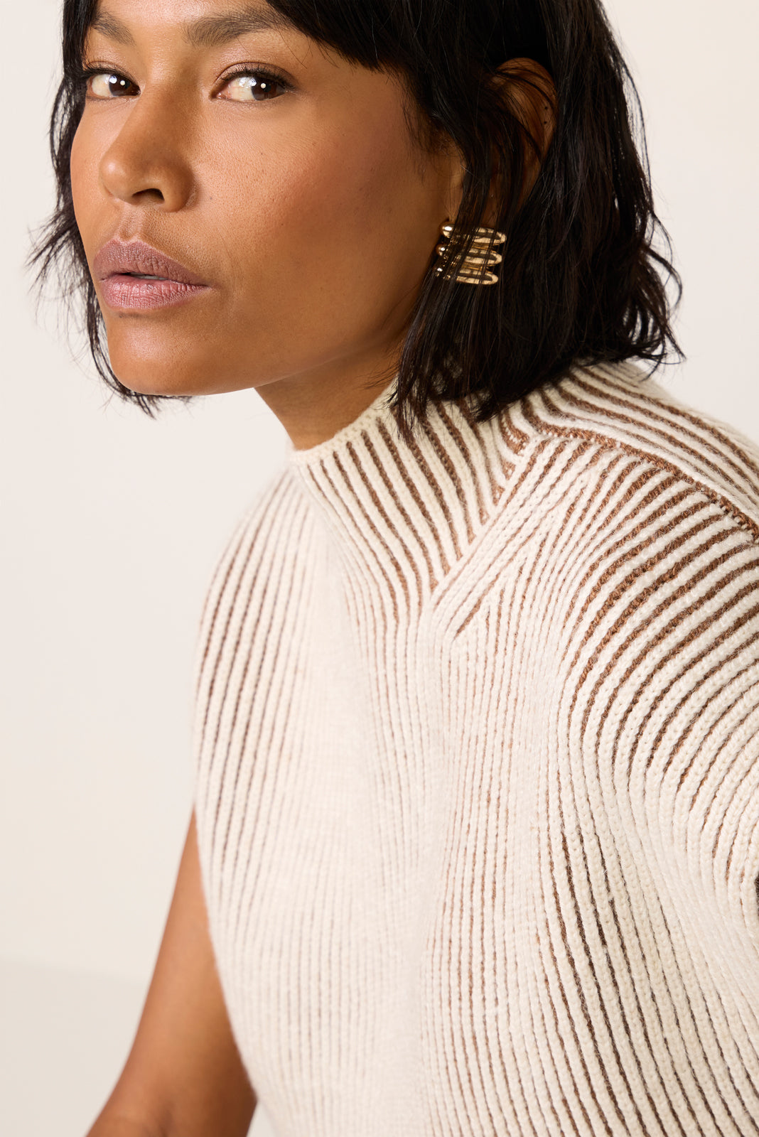 A modern silhouette defines the Lauren Plated Tank by Varley. featuring a soft Alpaca blend knit. a stepped hem. side splits. and fashioning details.