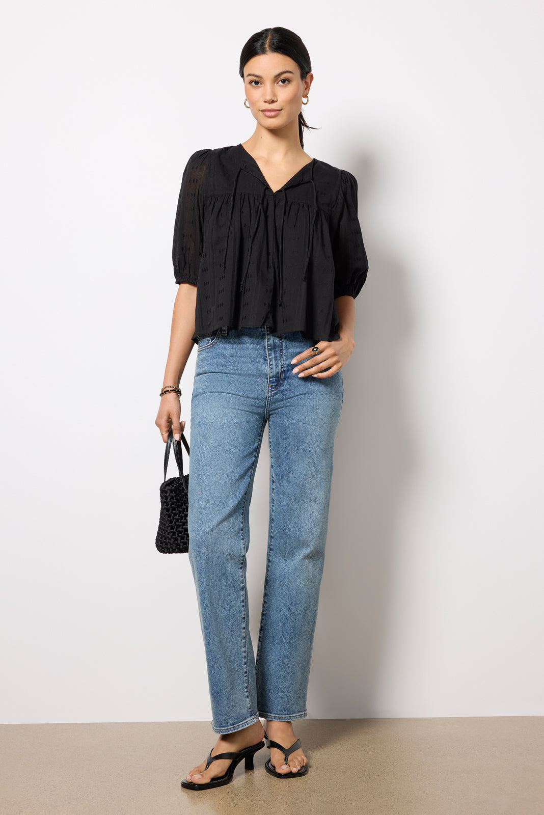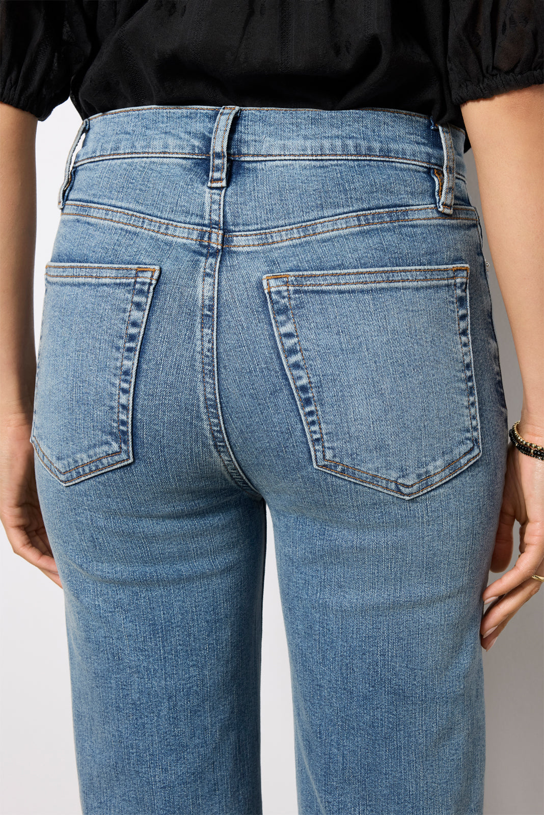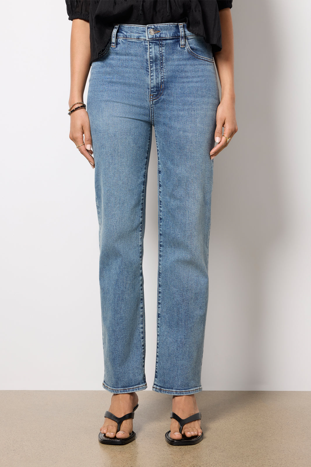 Perfect for wearing day or night. these versatile straight leg jeans by FRAME are crafted?from sustainable comfort-stretch denim and feature a flattering high-rise fit. medium blue wash. and clean hems.