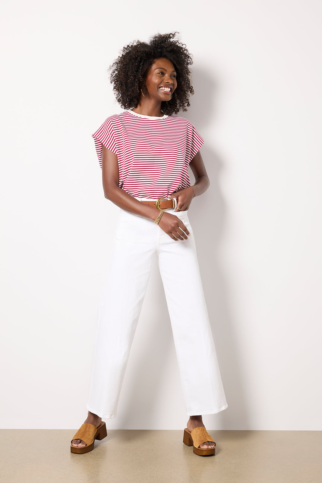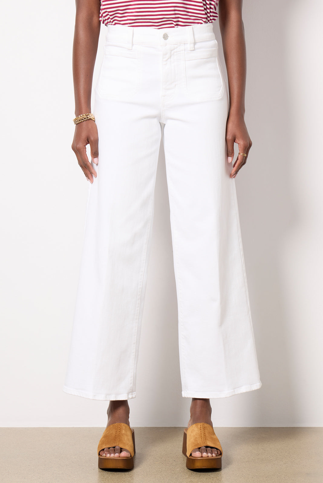 A wide leg jean that fits and flatters. the Le Slim Palazzo Jean by FRAME is crafted in soft stretch denim with a full-length inseam. crisp white wash. and patch pockets at the front and back.
