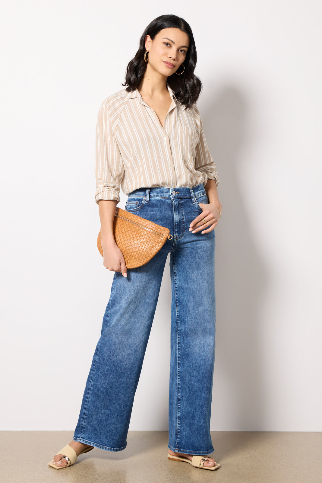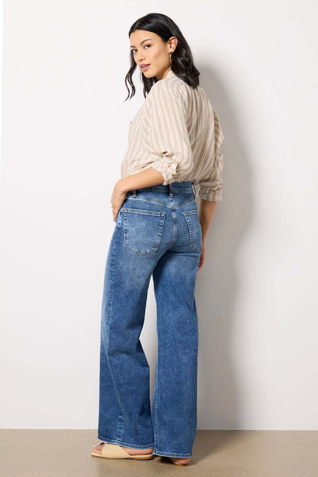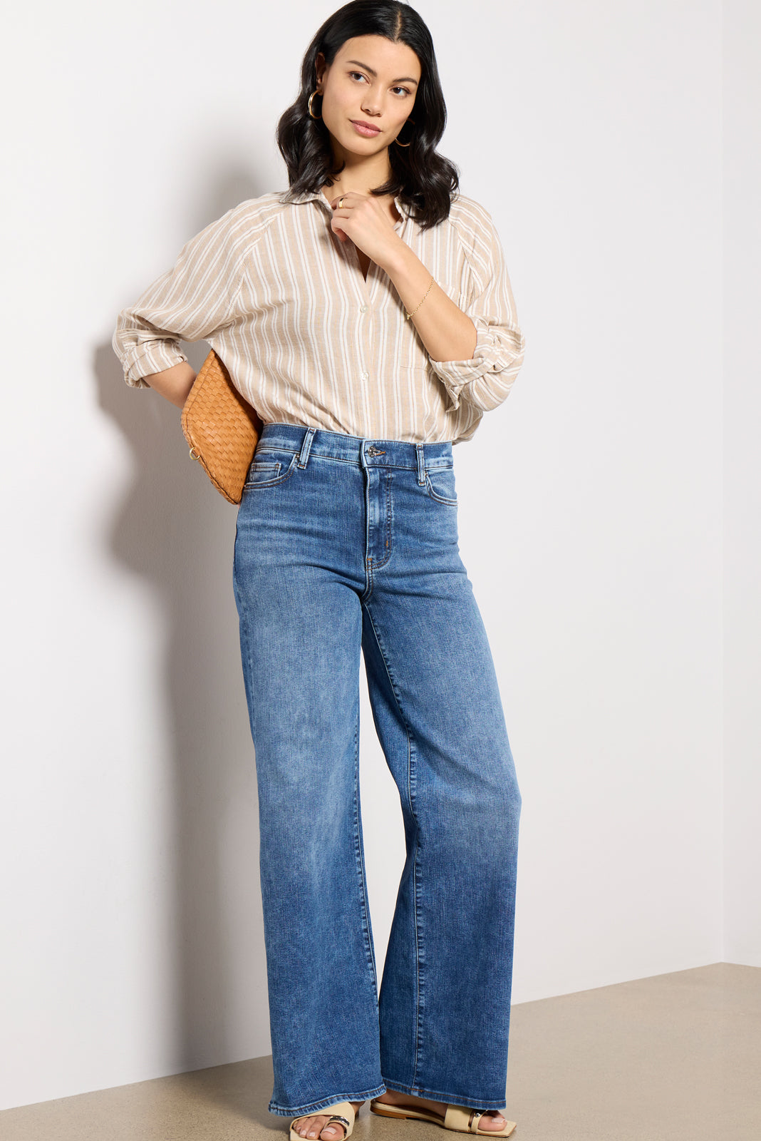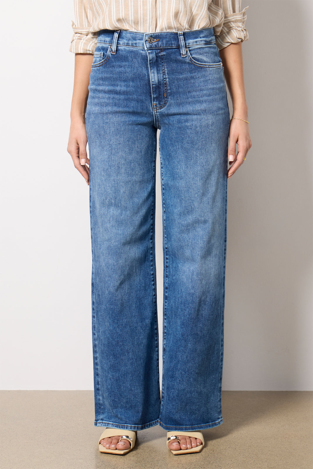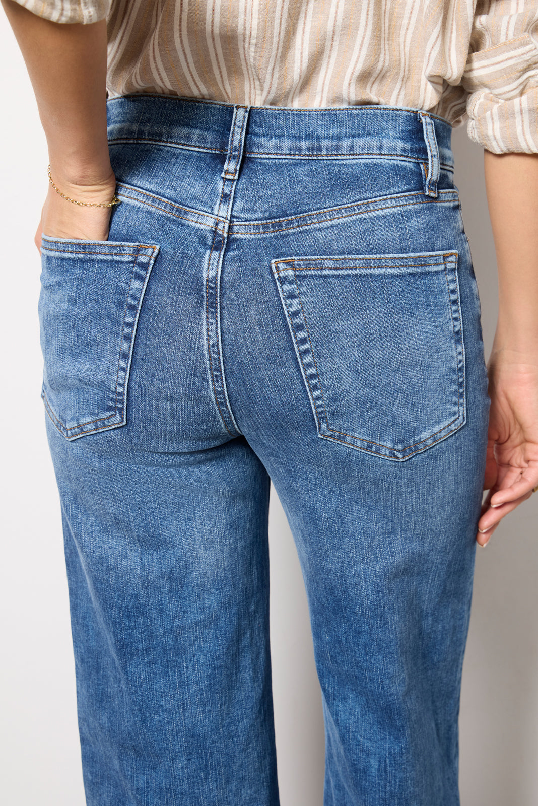 A wide leg jean that fits and flatters. the Le Slim Palazzo by FRAME is crafted in soft stretch denim with a high-rise waist. full-length inseam. and medium blue wash for day-to-night wear.