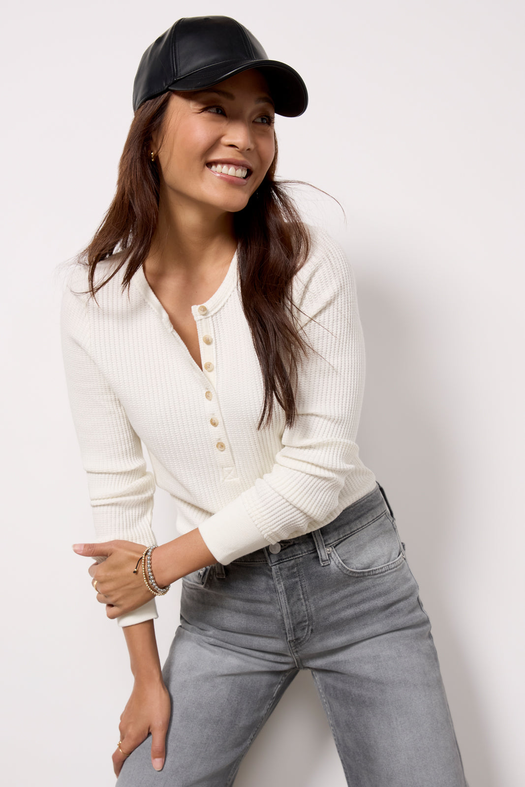 An elevated wardrobe essential. this long sleeve tee by Faherty is crafted in a soft waffle knit and features a button henley neckline. curved hem. and back center seam detail. Tuck into jeans. or layer it with a puffer vest.