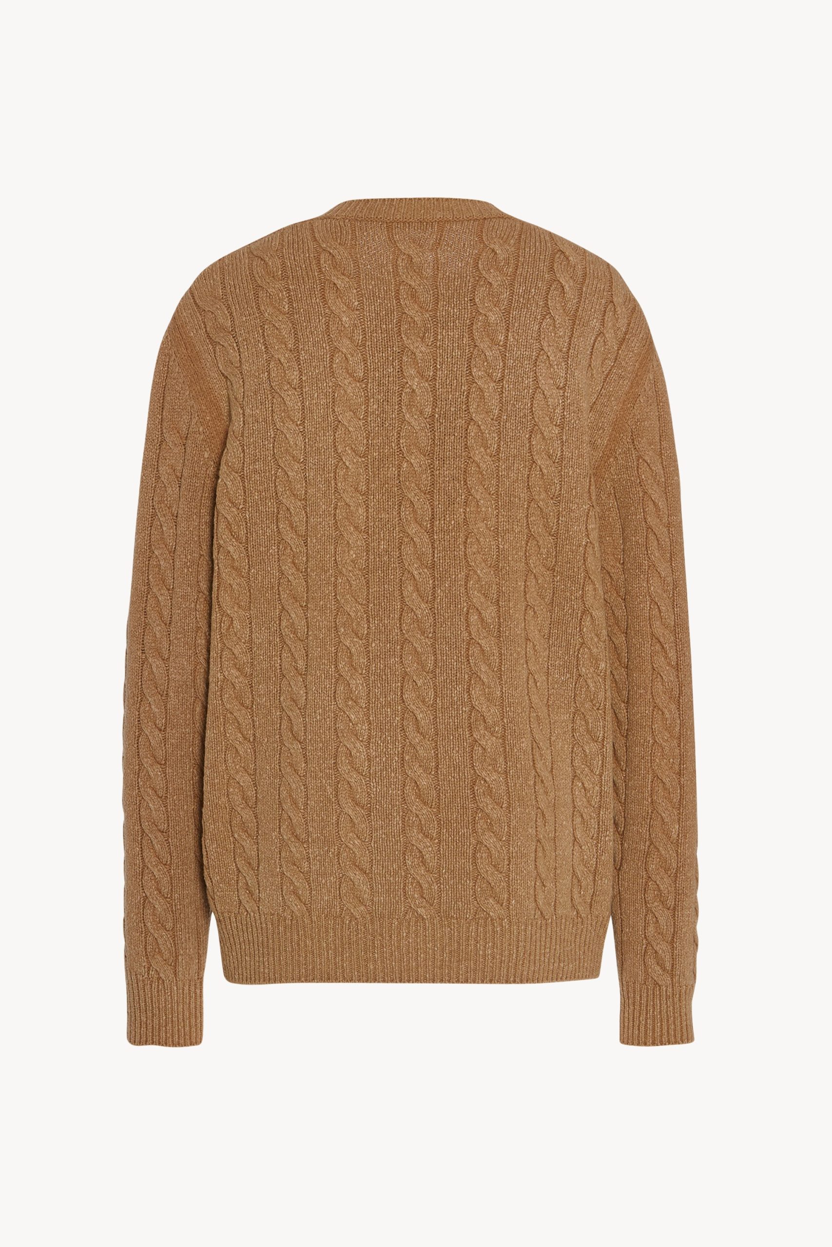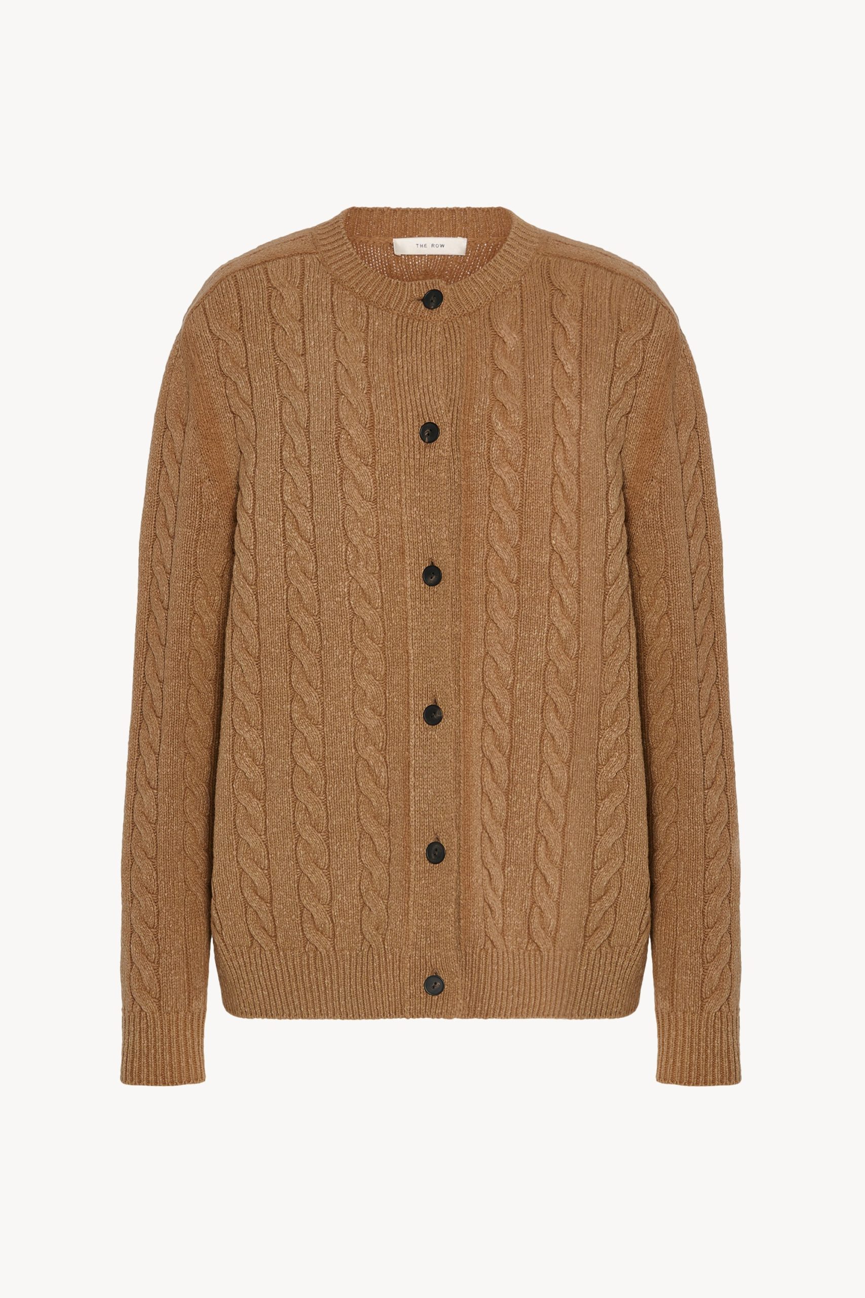 Classic cable-knit cardigan in textured wool with relaxed fit. front button closure. and ribbed neckline cuffs. and hem.