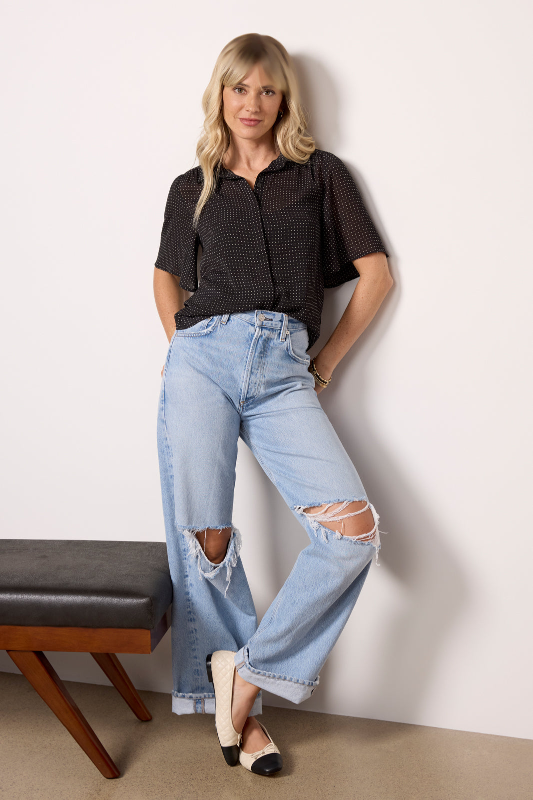 Perfect for work-to-weekend wear. this so-chic top by EVEREVE is crafted in semi-sheer dotted fabric with short sleeves. a collared neckline. and a covered button placket. Wear tucked into your favorite jeans or trousers.