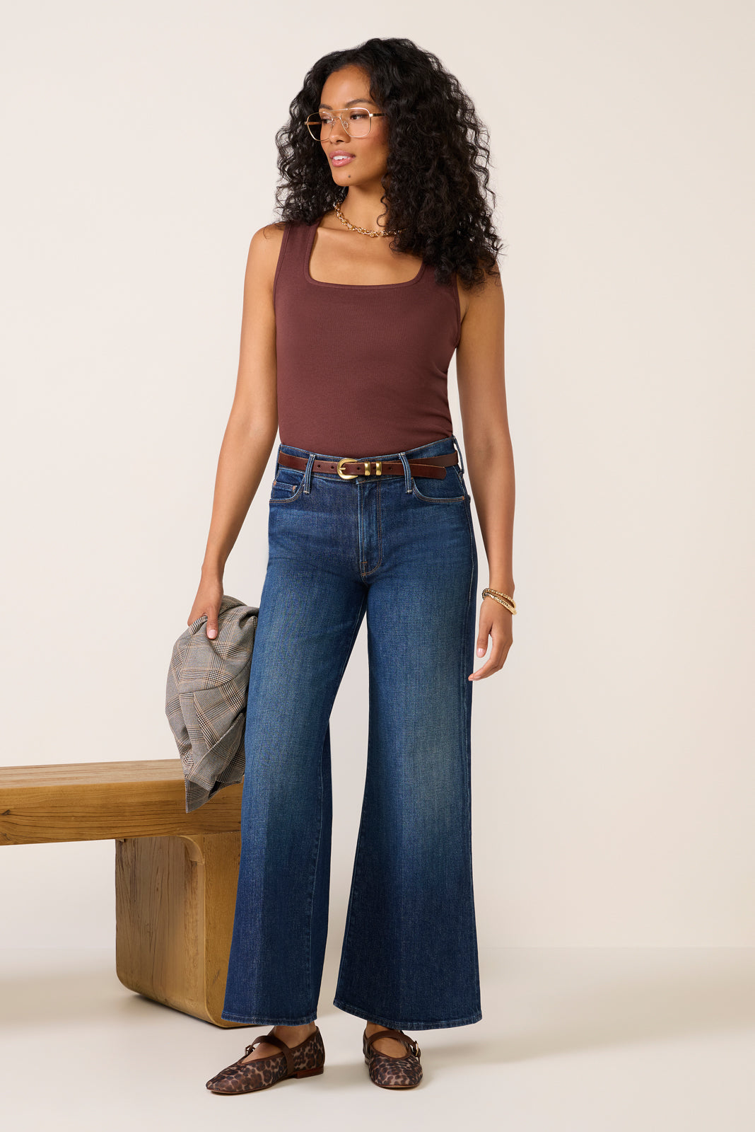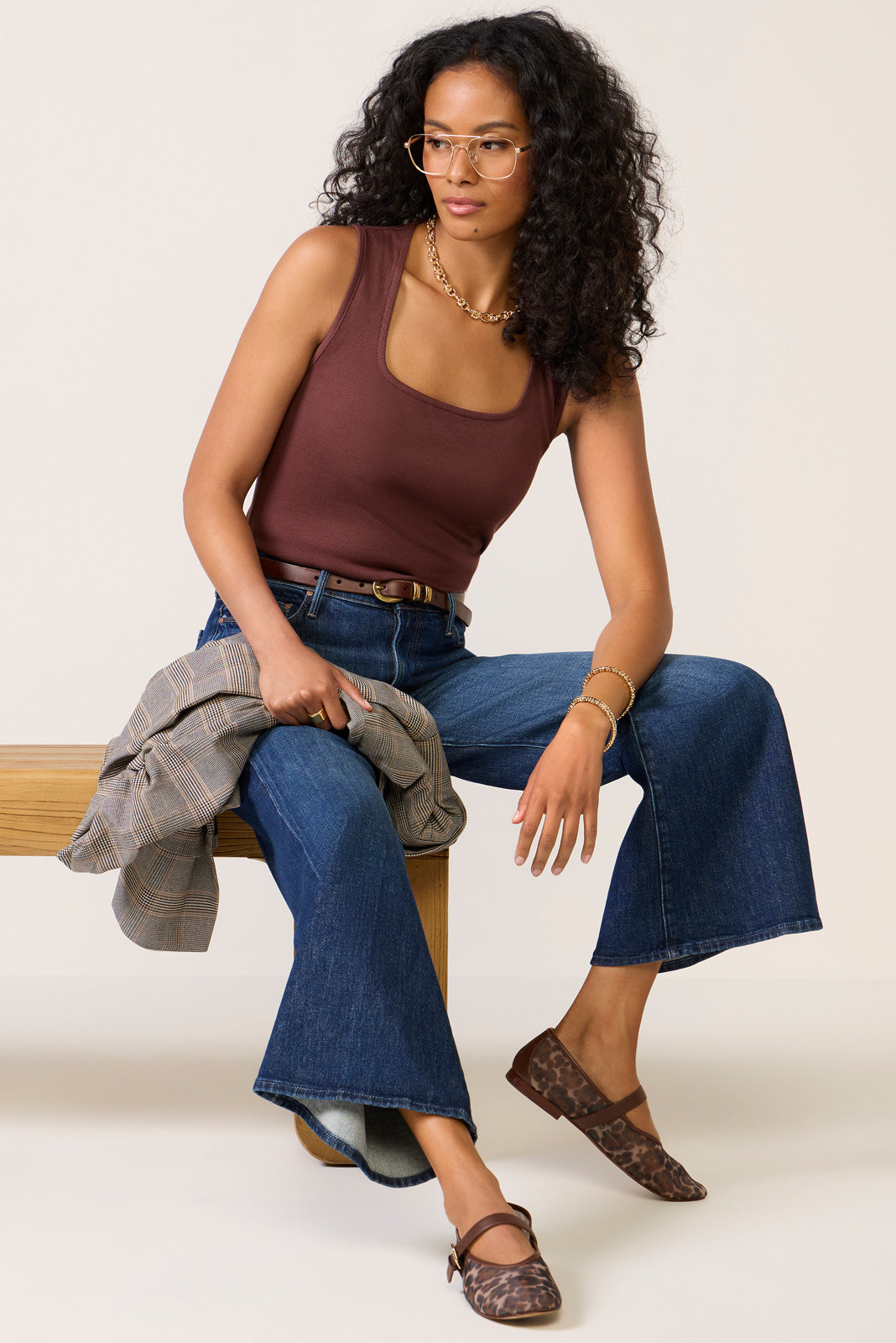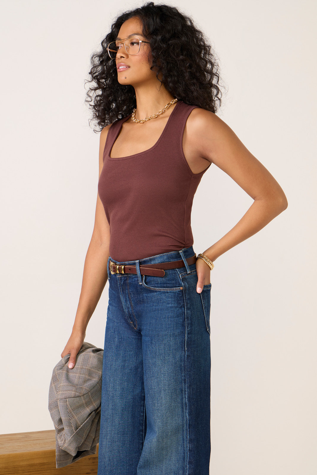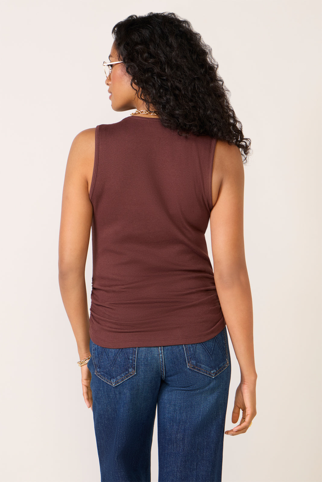A chic square neckline defines this versatile tank top by Michael Stars. finished in soft rib knit fabric with ruching at the?sides for a flattering touch.