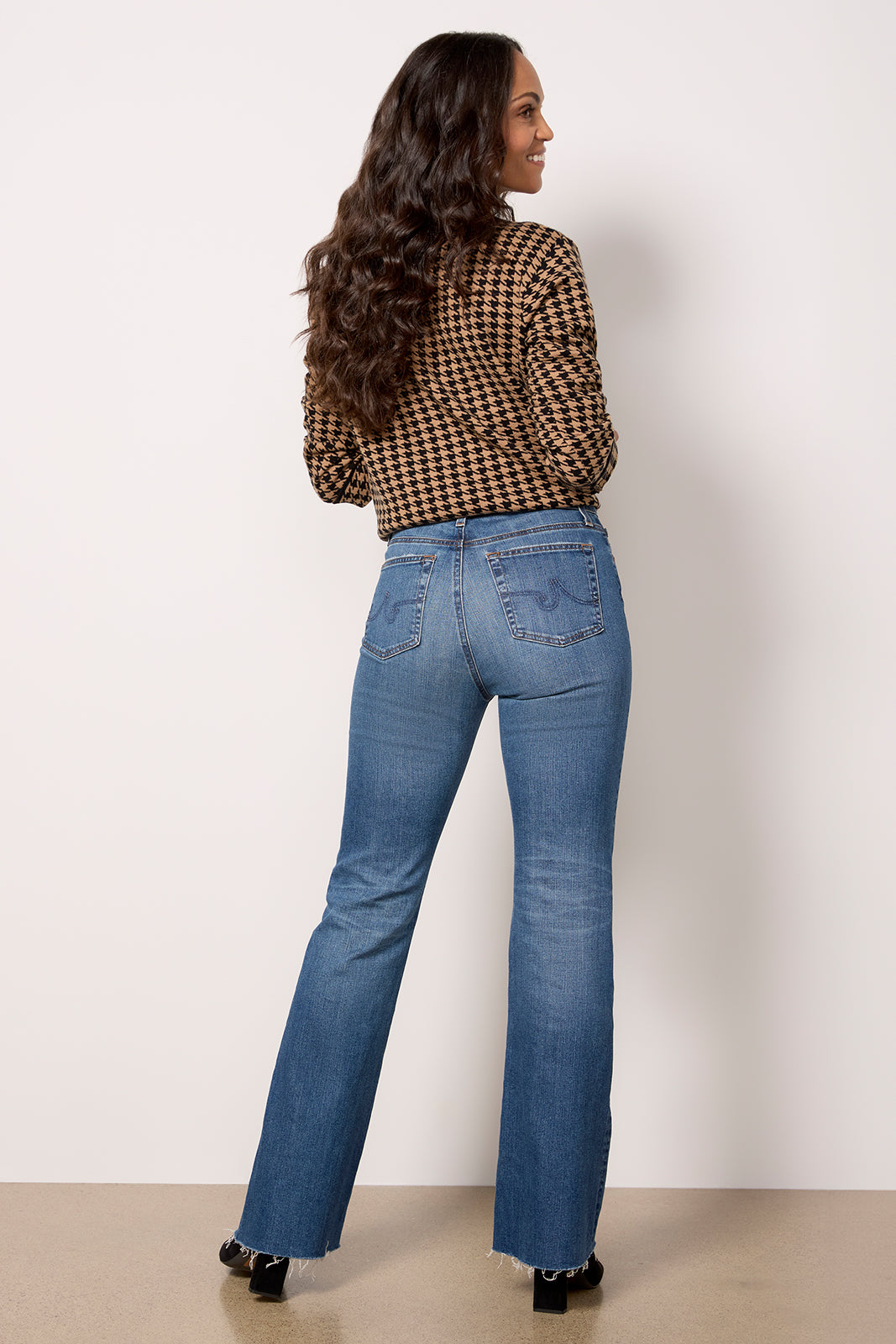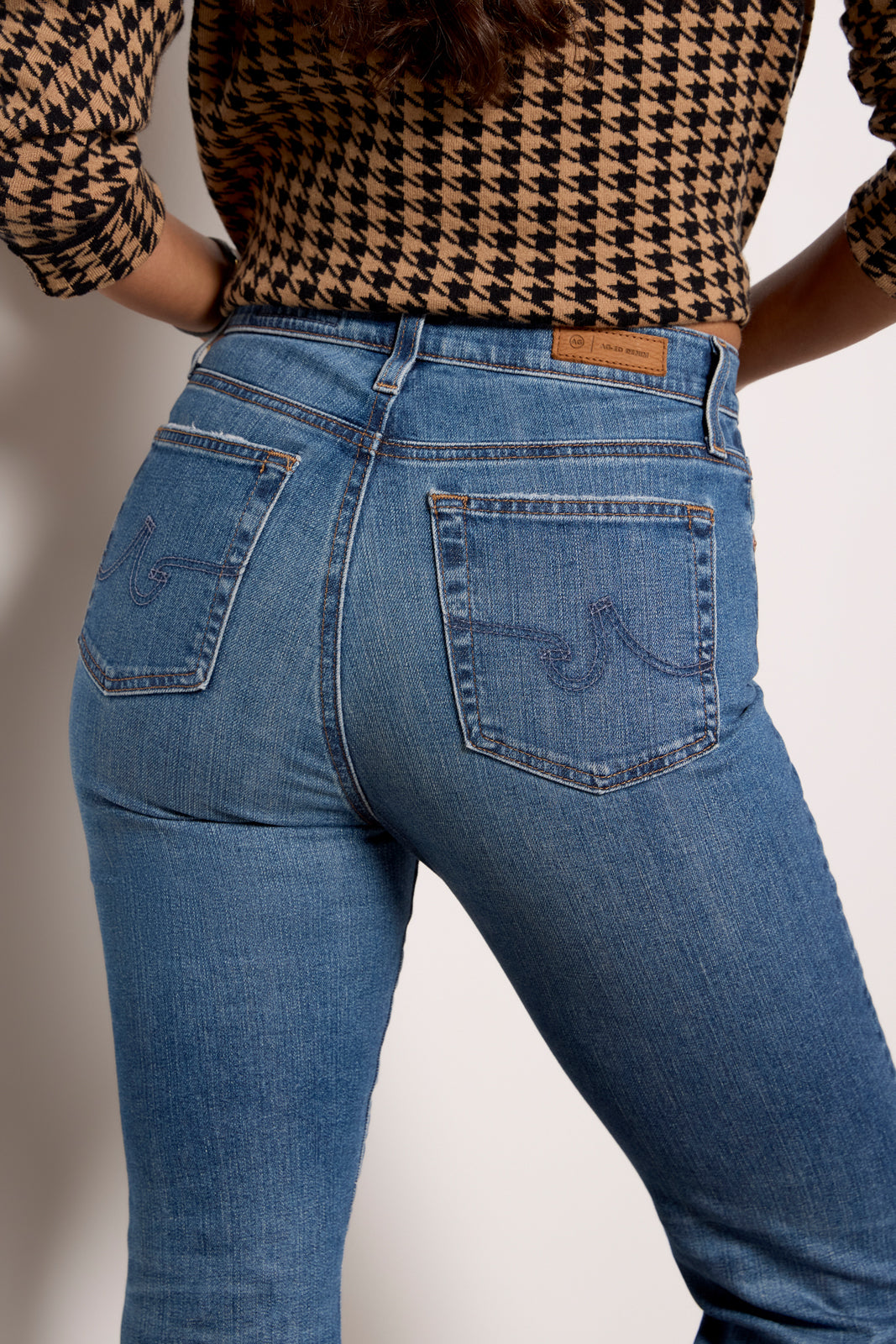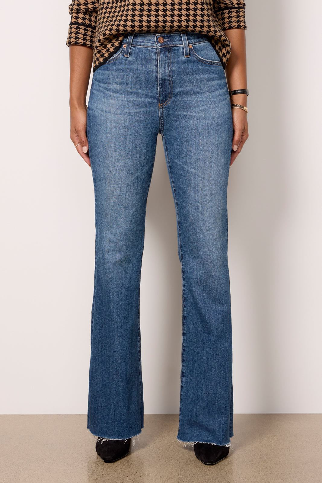 Dressed up or down. these high-rise flares by AG are the perfect addition to your denim collection. designed with a full-length inseam. faded blue wash. and raw hems.