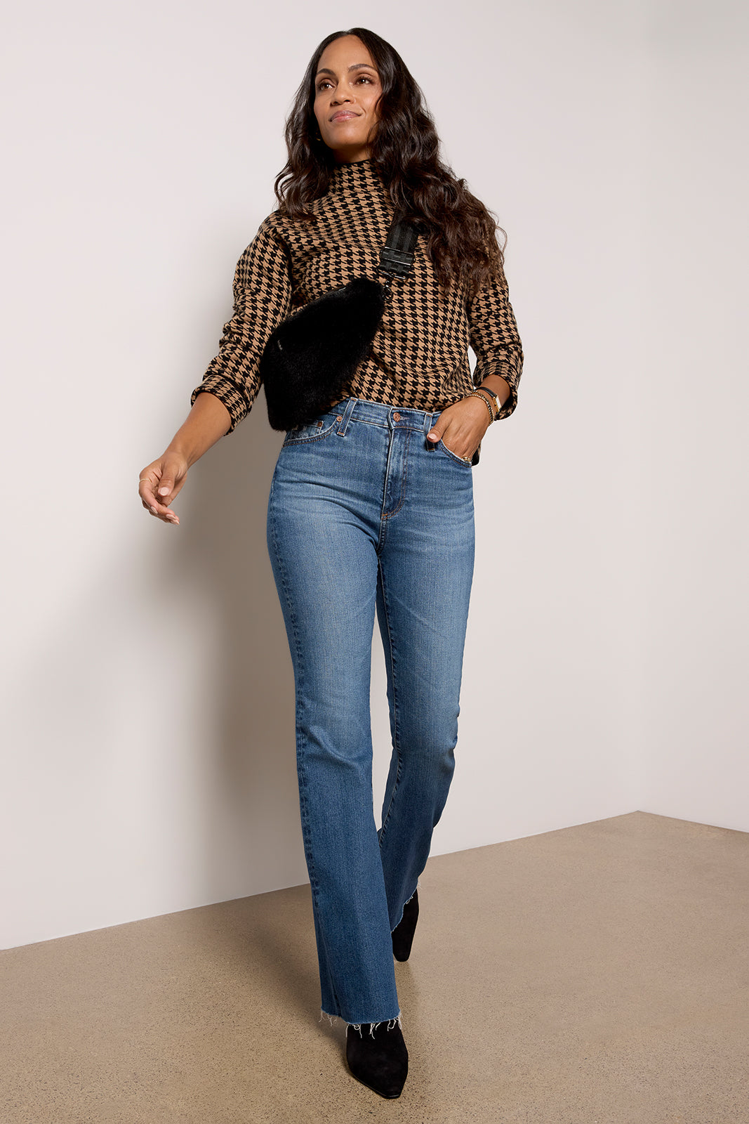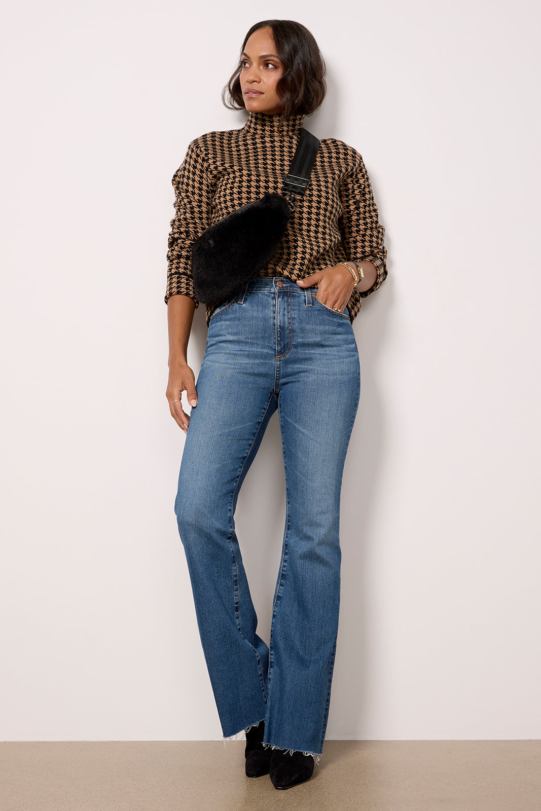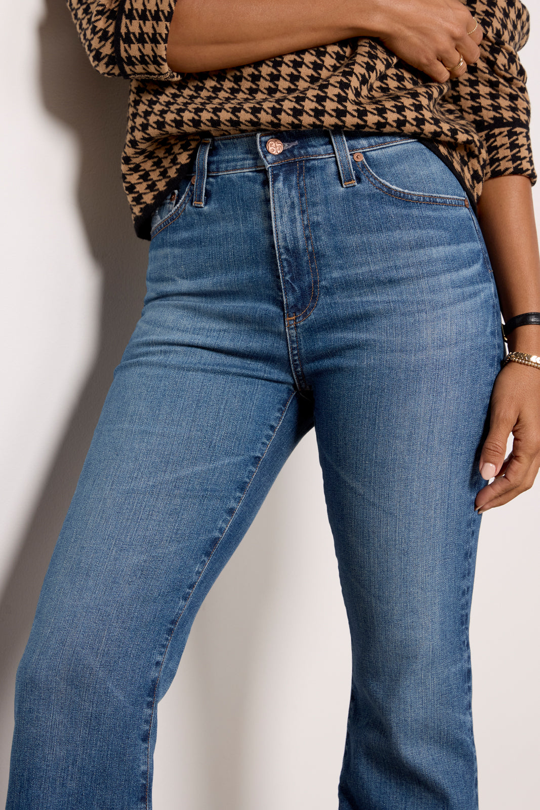 Dressed up or down. these high-rise flares by AG are the perfect addition to your denim collection. designed with a full-length inseam. faded blue wash. and raw hems.