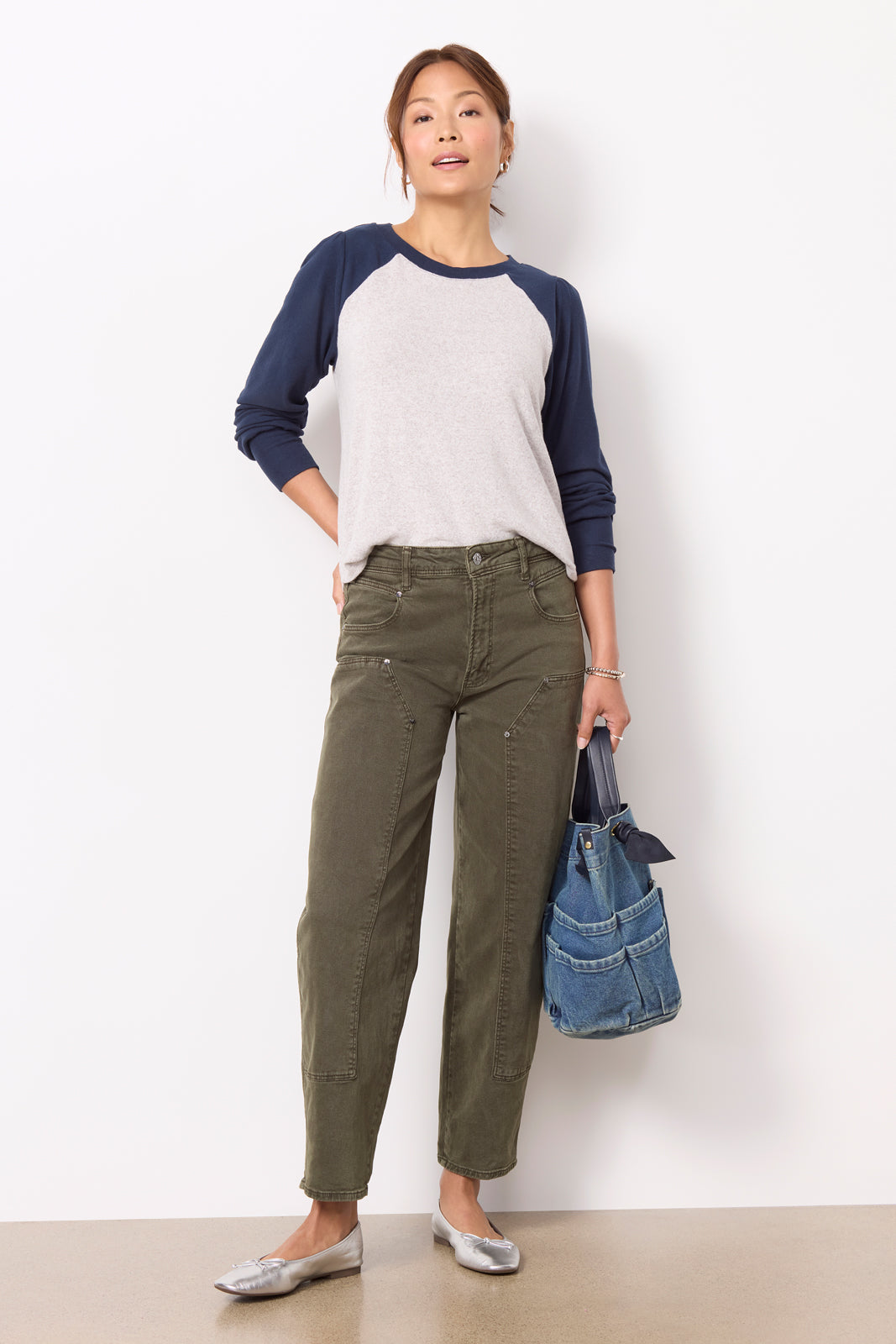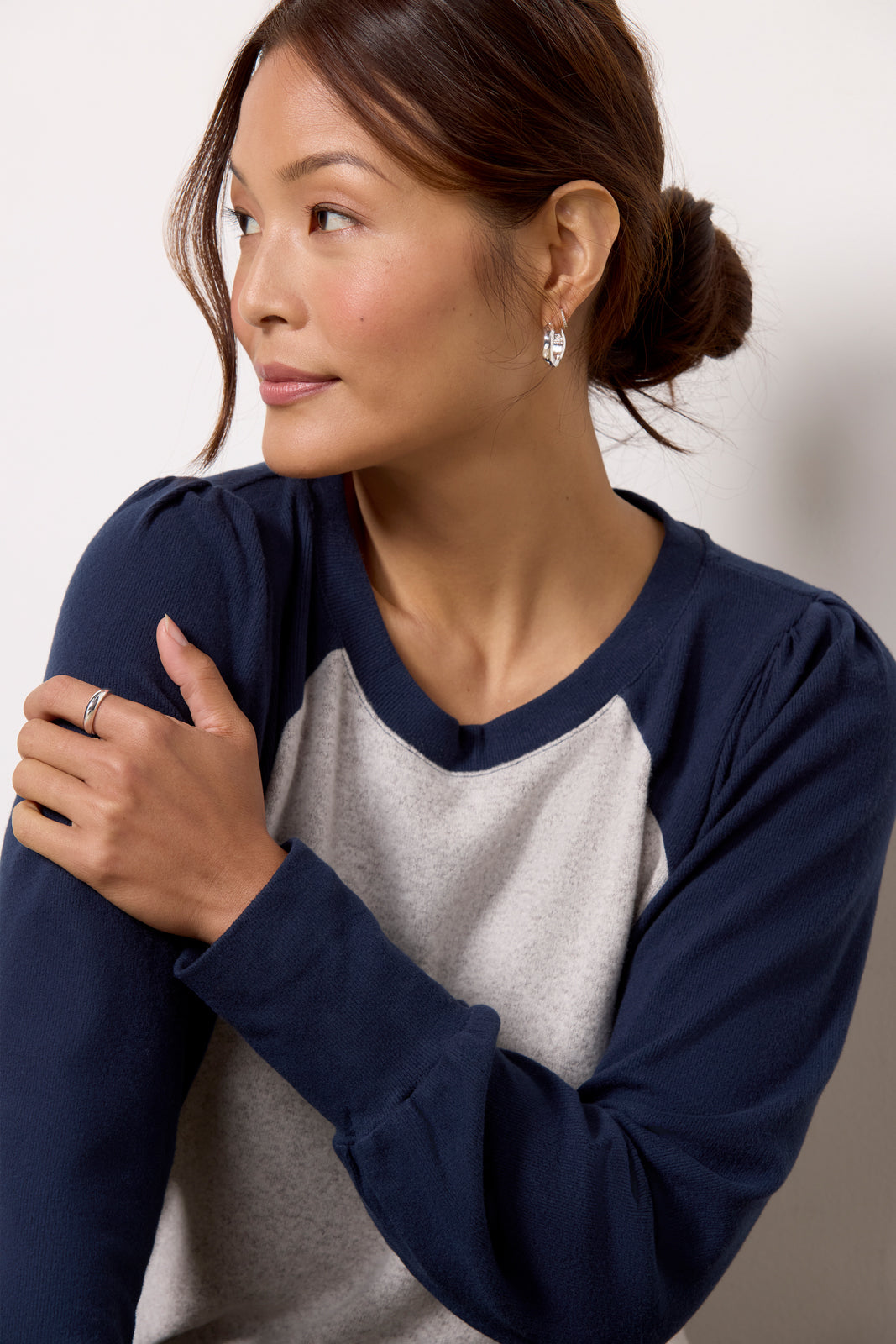 Brushed knit fabric adds a cozy-chic vibe to this varsity tee by EVEREVE. featuring a colorblocked design. curved hem. and rib knit sleeves with a pleated shoulder detail. You’ll be wearing it on repeat with your favorite jeans. leggings. and cargo pants.