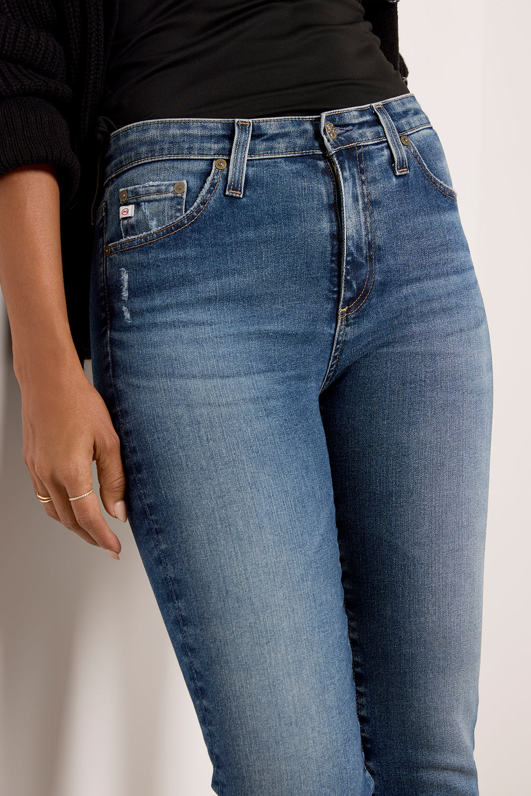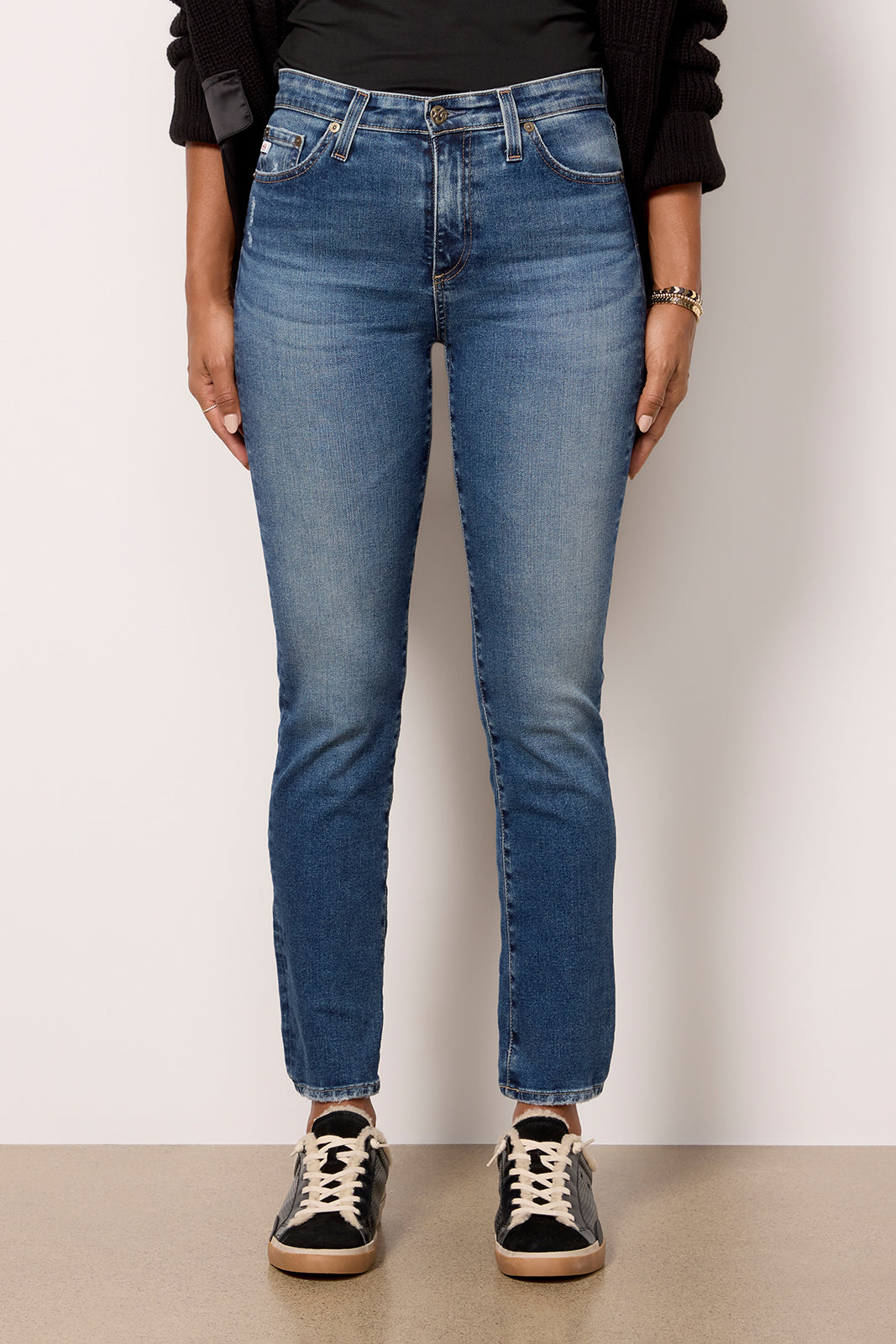 A slim straight leg creates the sleek silhouette of these AG jeans. featuring a mid-rise waist. full-length inseam. and a hint of distressing at the pocket and hems.?The faded blue wash makes them perfect for day-to-night wear.
