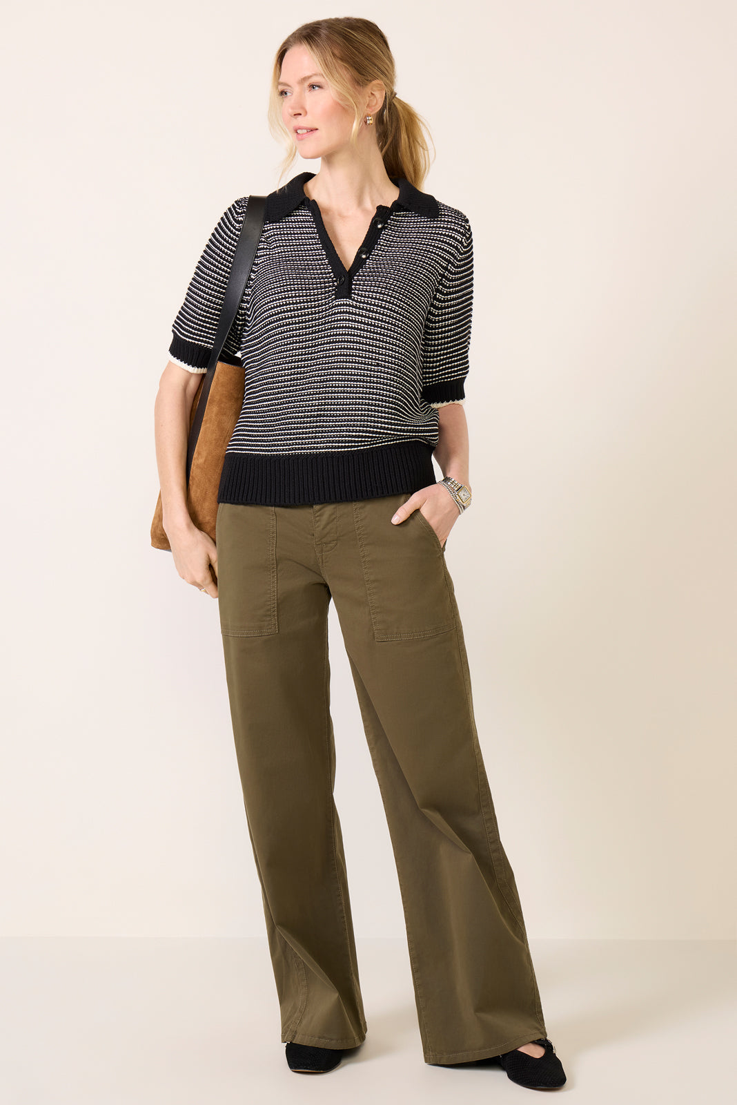 Add to your lightweight summer sweater collection with the Marley Striped Pullover by Michael Stars. featuring a polo collar. button neckline. rib knit detailing. and a relaxed fit.?