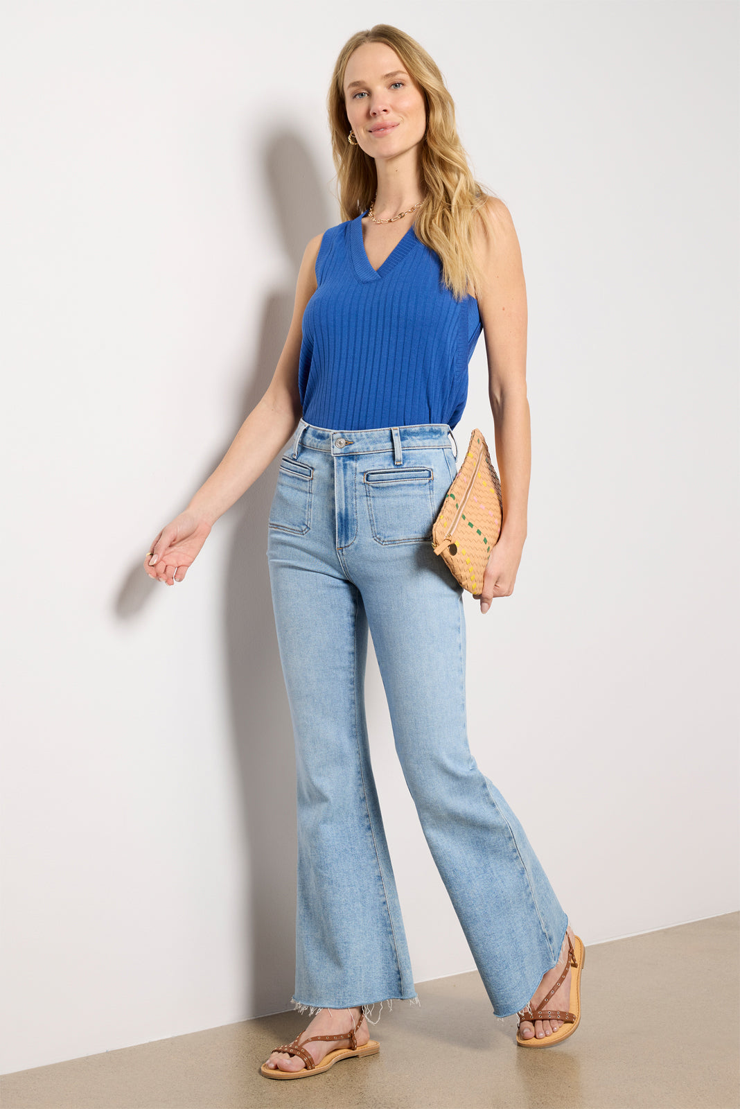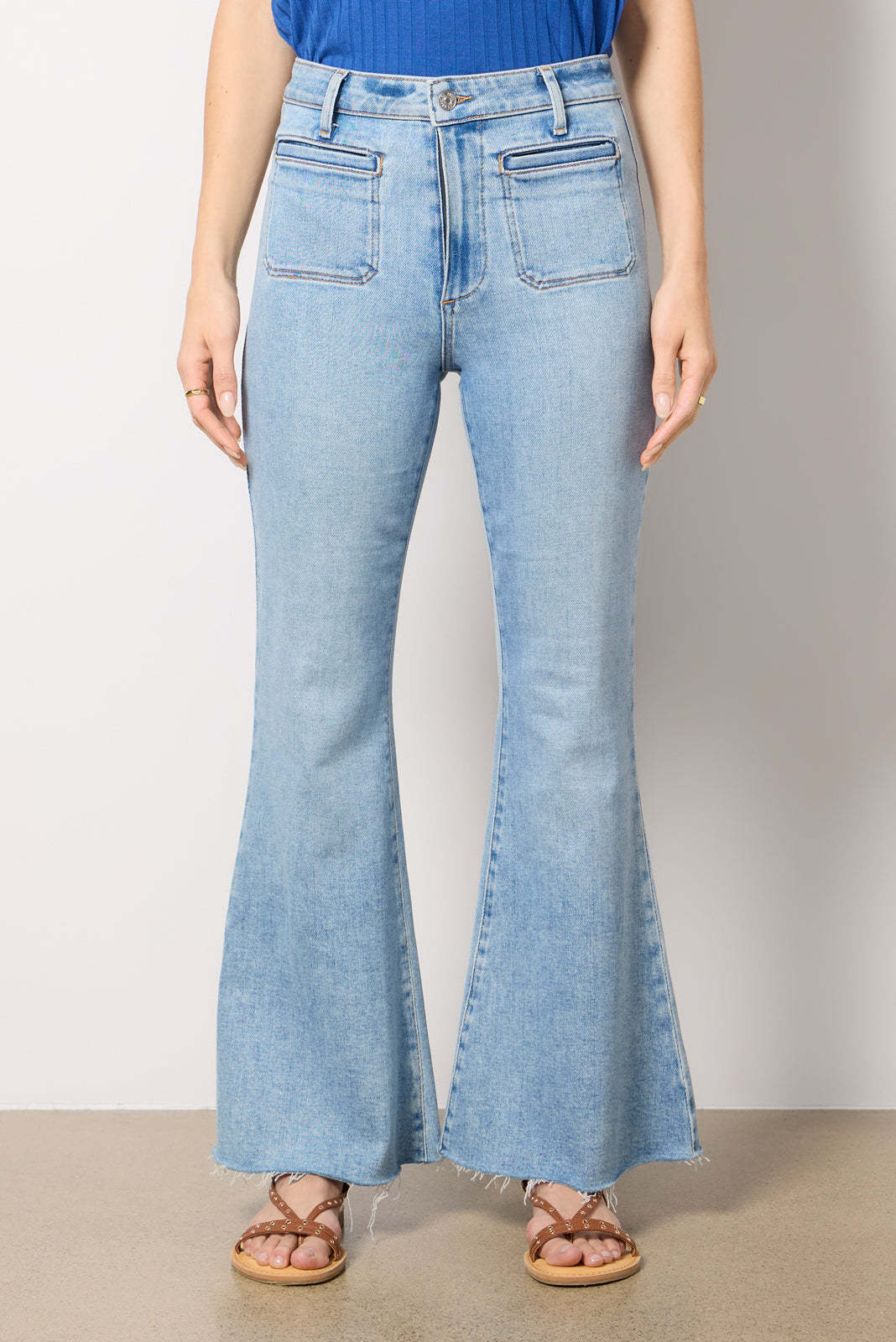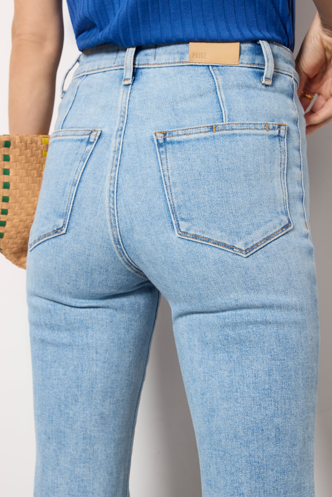 Welt pockets define the flattering Marlow Skimmer Jean from Paige. featuring stretch cotton denim. high-rise waist. and a flare leg silhouette with a full-length inseam.?