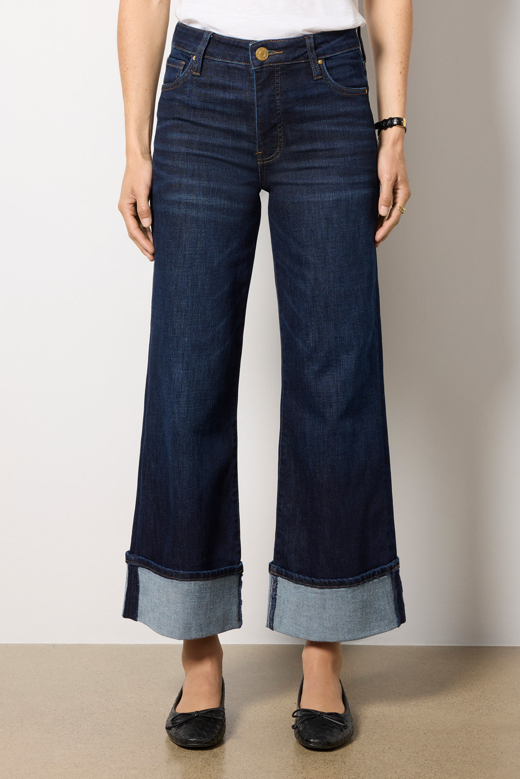 Cuffed hems update the most-loved Meg jean by Kut From The Kloth. Perfect for any day-to-night look. these wide leg jeans are crafted in soft. comfort-stretch denim with a?full-length inseam and dark blue wash.