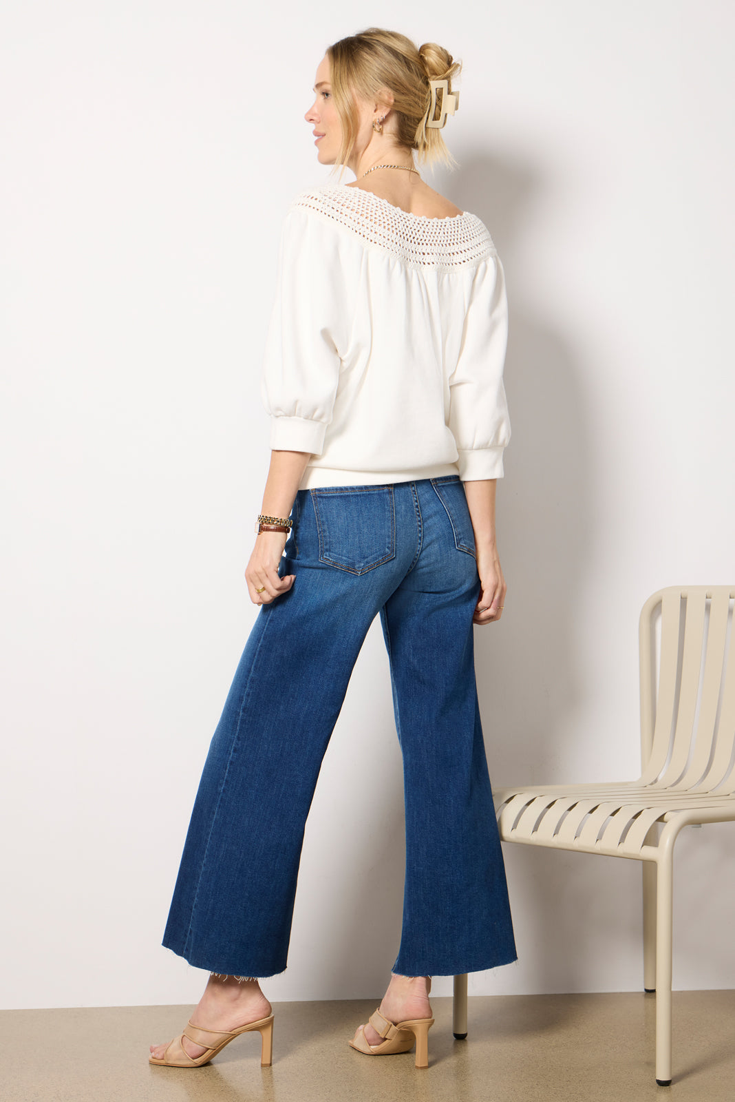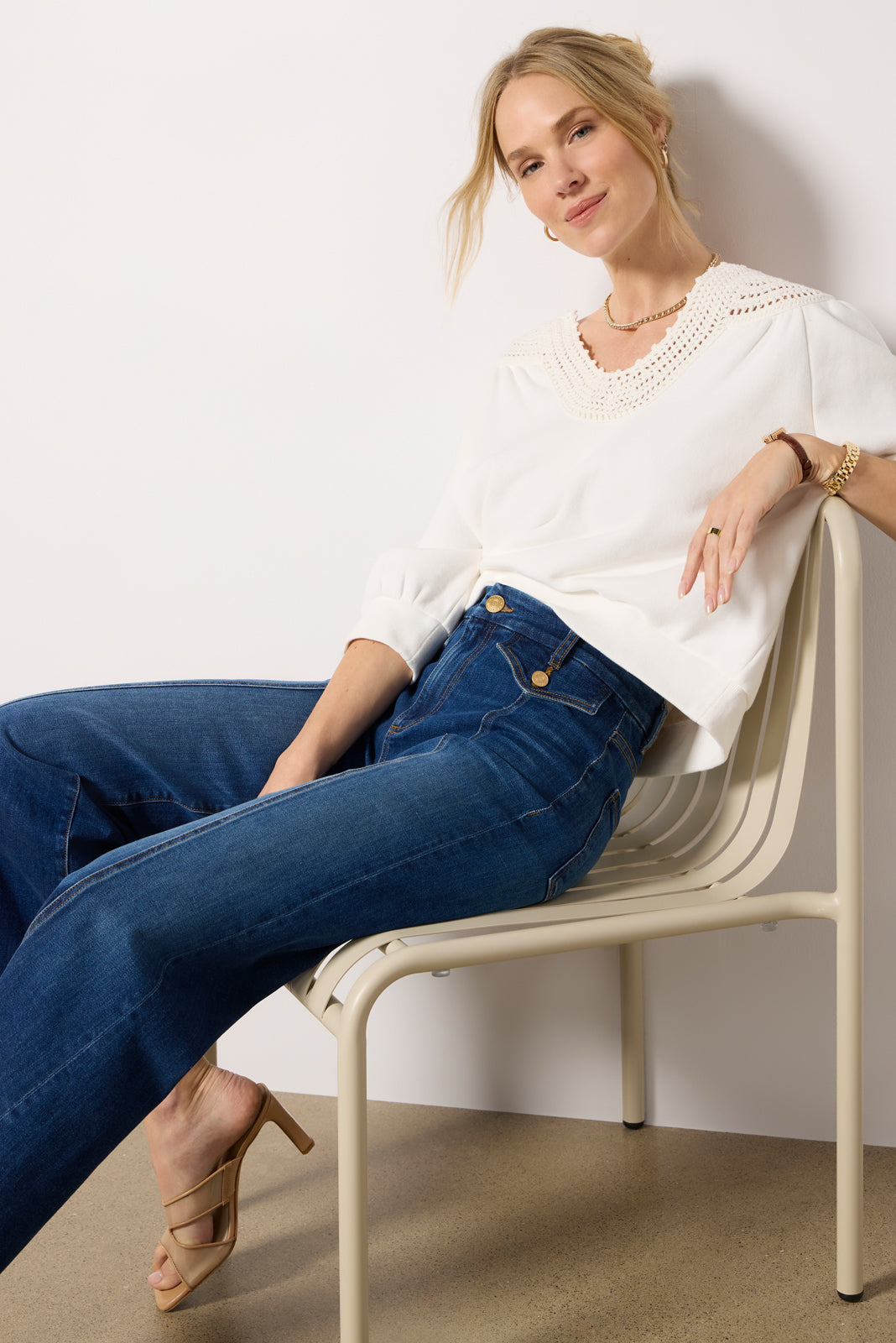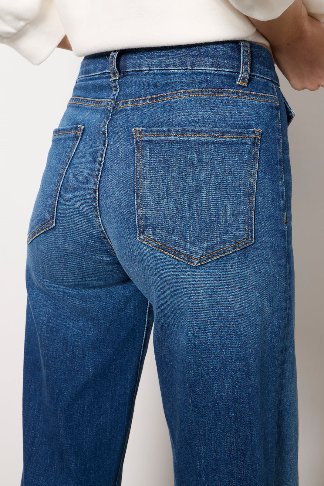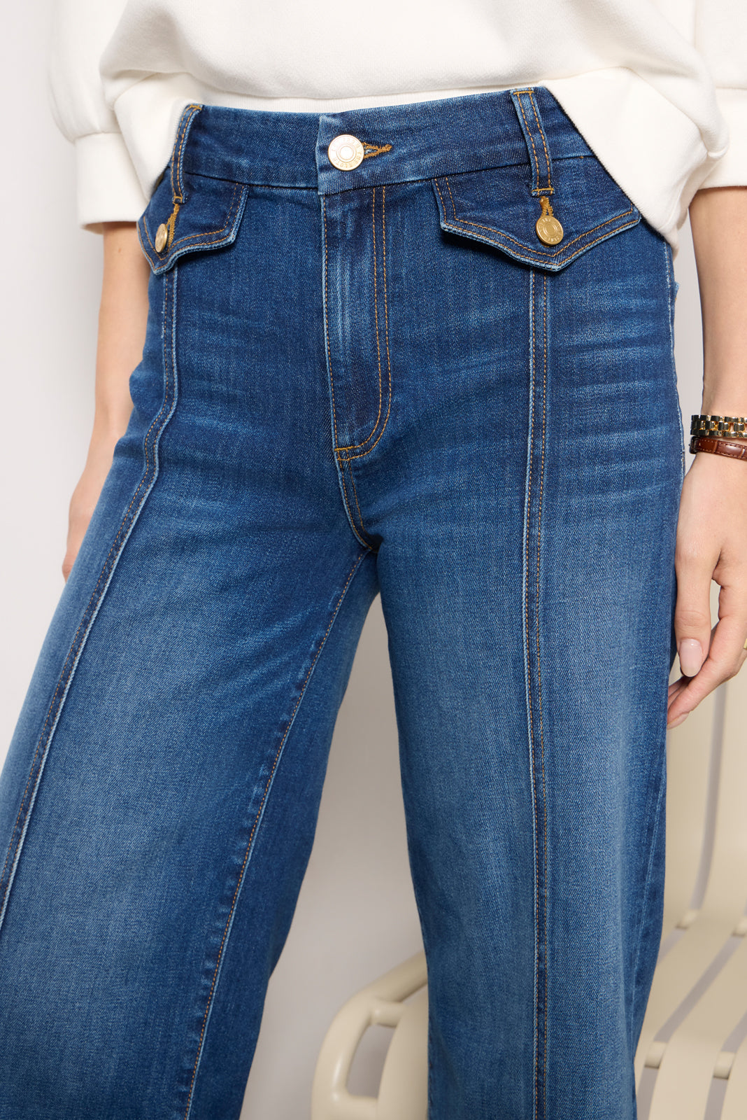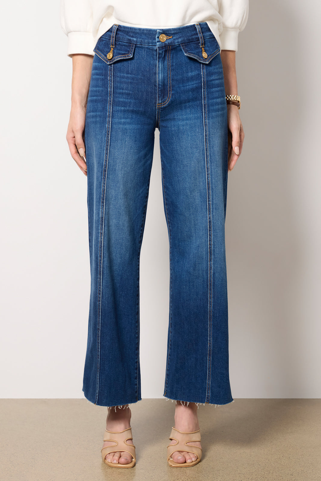 Crafted in a stretch cotton denim. the Meg Jean by Kut from the Kloth features a mid-rise waist. patch pockets with gold buttons. and front seam detailing.