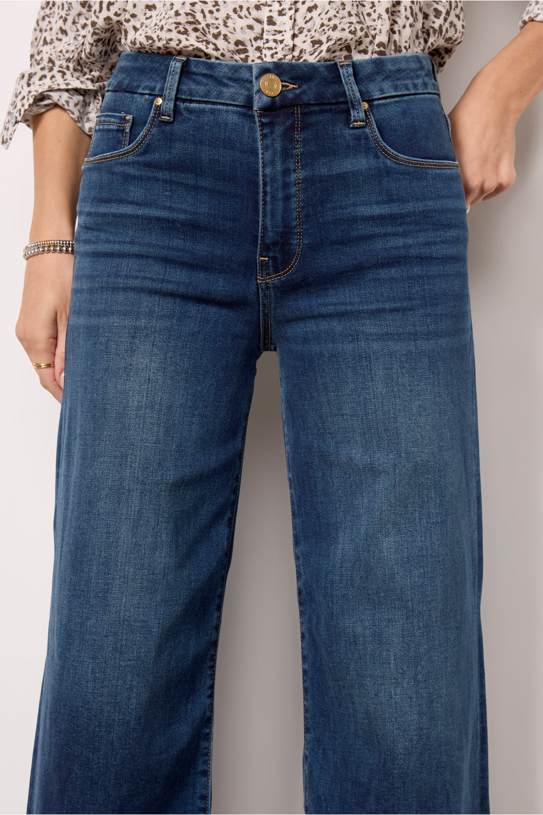 Round out your denim collection with the must-have Meg jean by Kut From The Kloth. This wide leg silhouette?is finished in a versatile dark blue wash with a?zipper fly closure and ankle-length raw hems. The soft comfort-stretch denim will move with you from day to night.