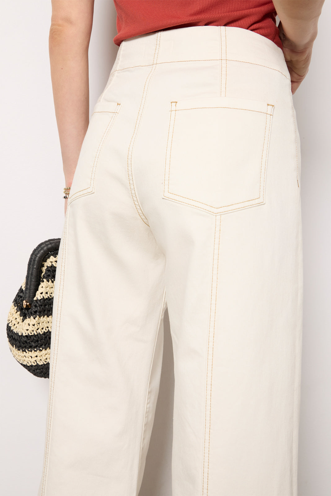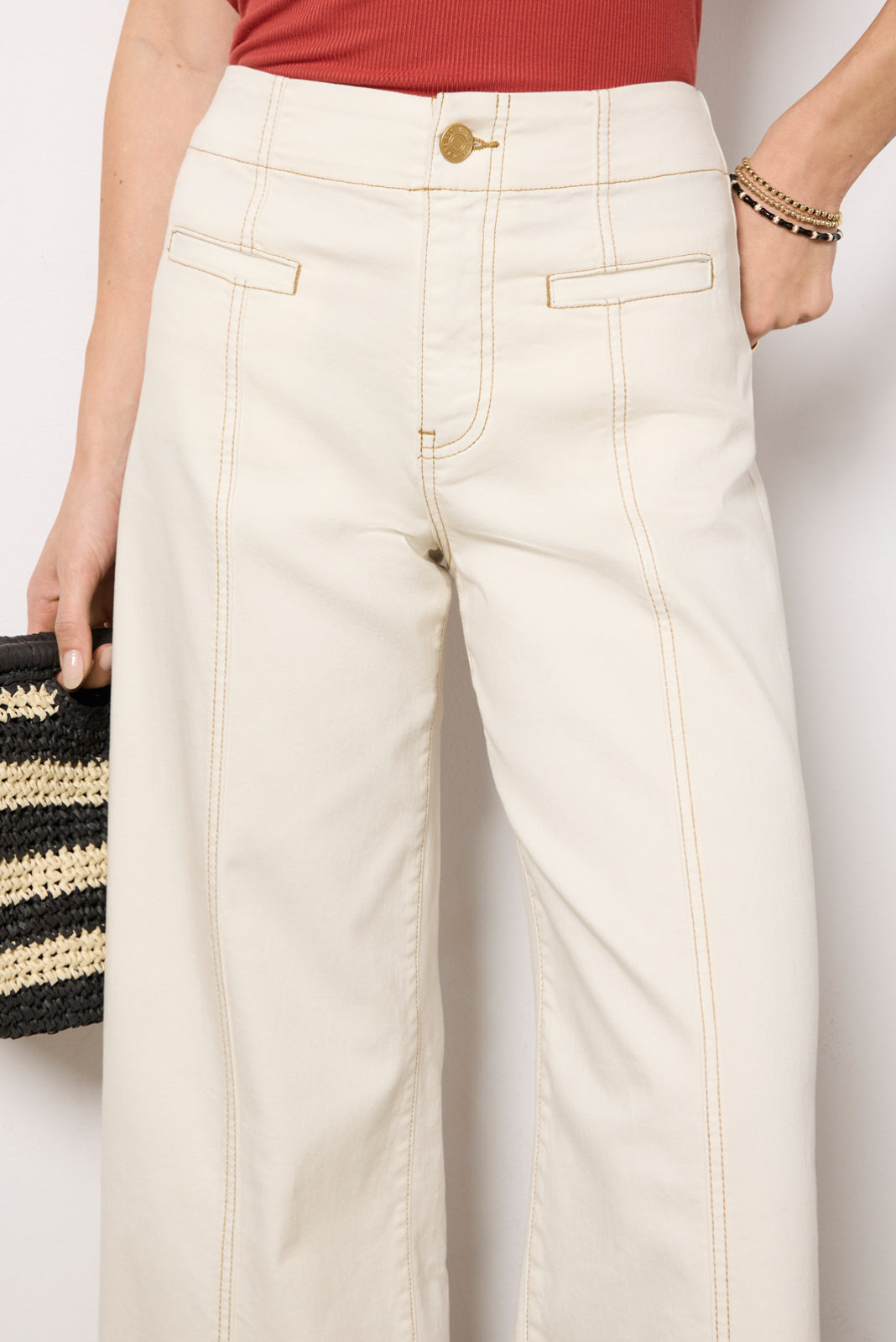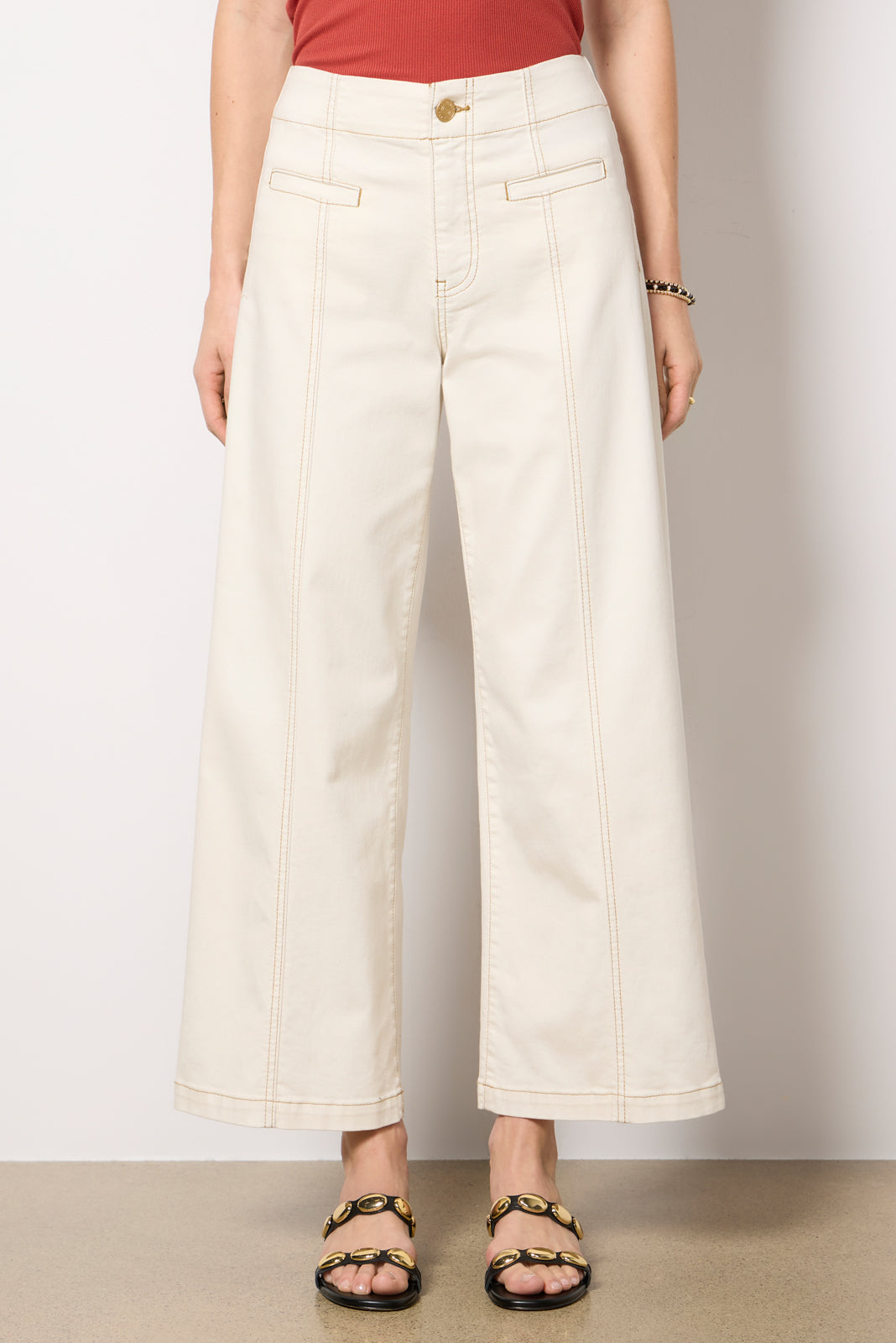Contrast stitching and front welt pockets update this most-loved silhouette by KUT From The Kloth. Finished in comfortable stretch fabric. the Meg Wide Leg features a flattering high-rise fit. vertical seam detailing. and ankle-length hems.