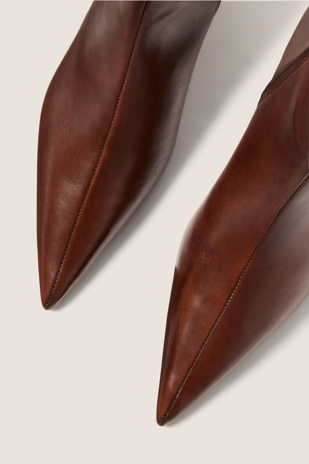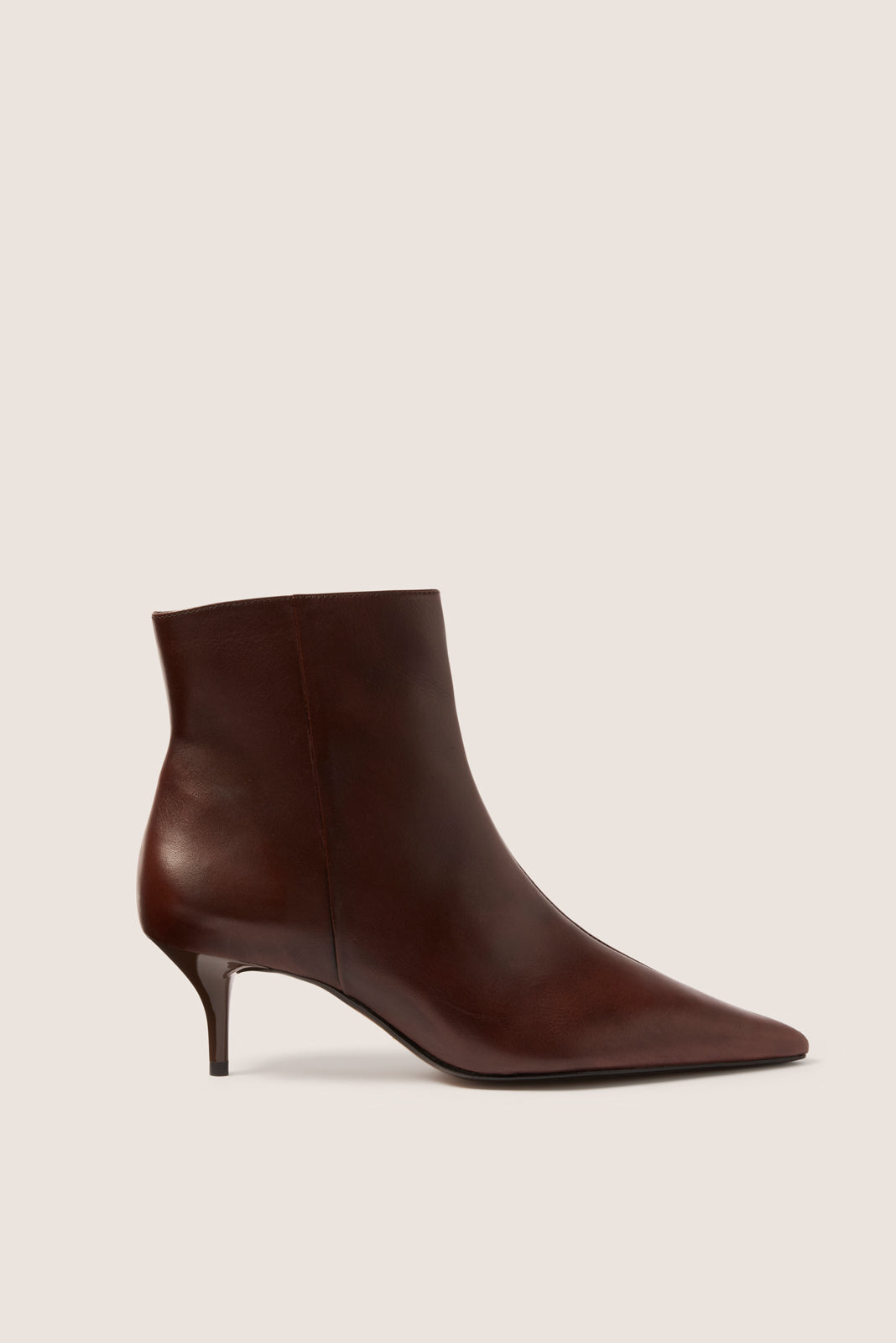 Elevate any look with the Mikki Mid Bootie by Schutz. Crafted in smooth leather. these versatile ankle boots feature a chic pointed toe. inside zipper closure. and stiletto heel.