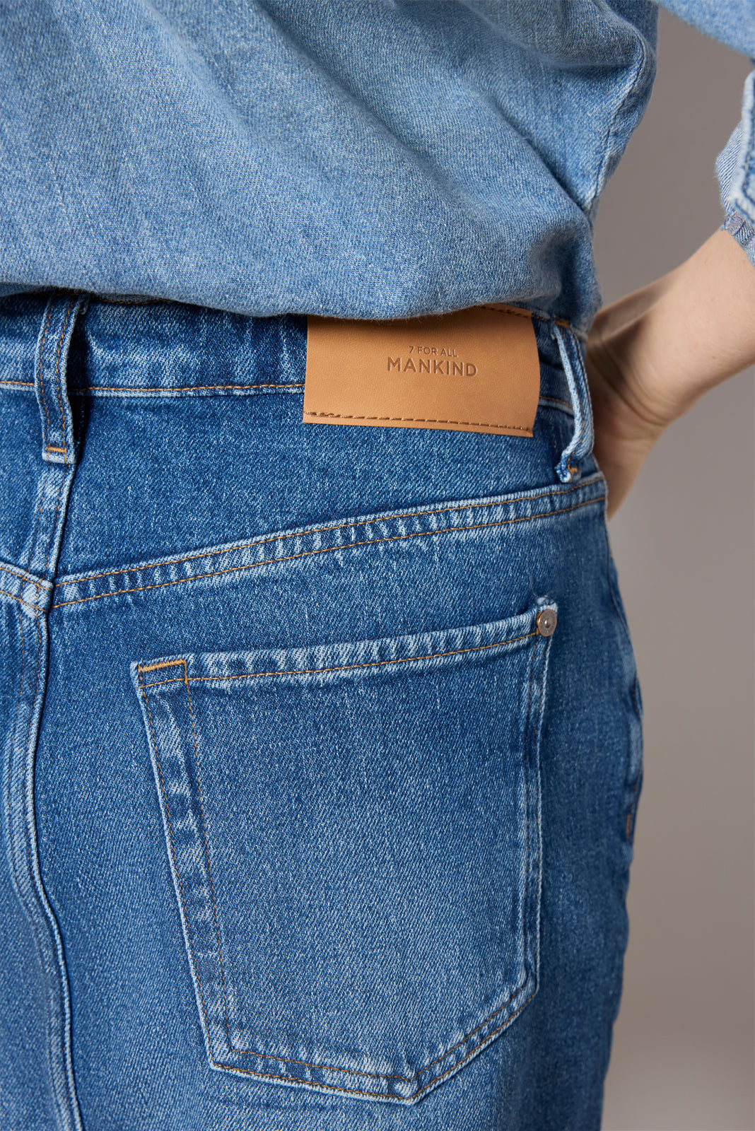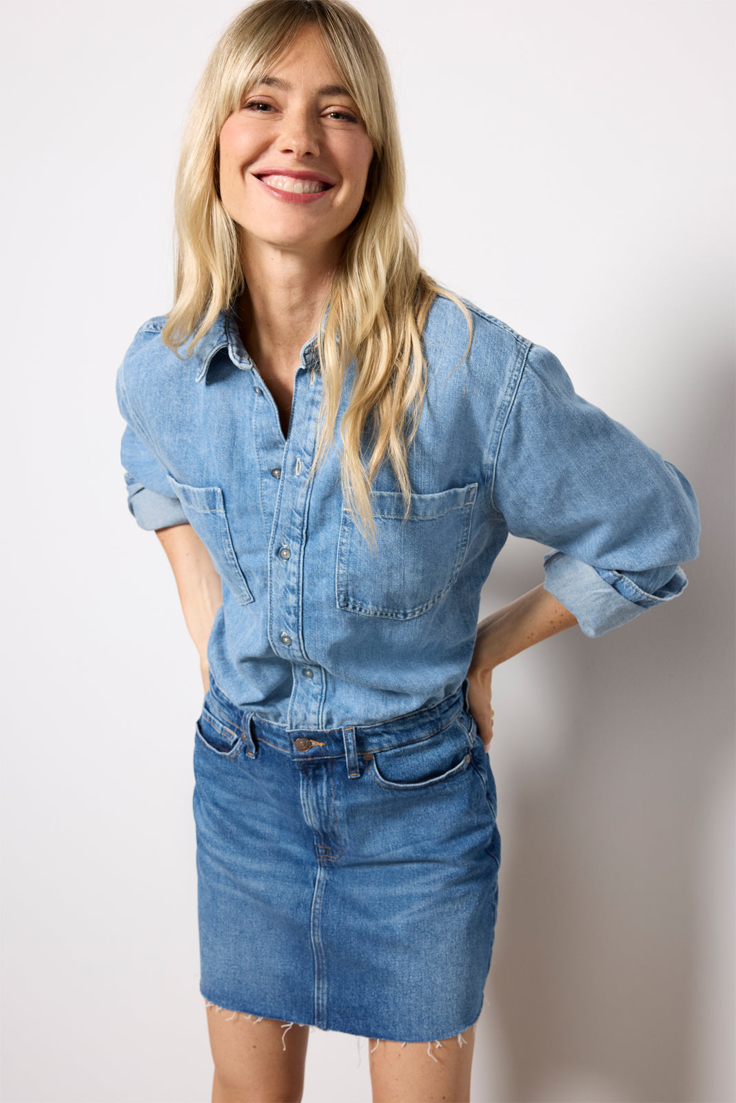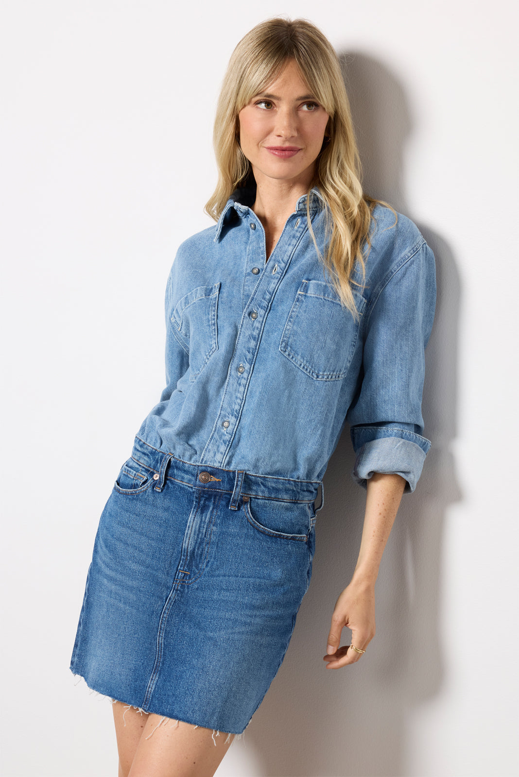 The Mini Skirt Dress by 7 For All Mankind is perfect for an all-in-one denim look. featuring a raw-hem mini skirt and an attached button-down top with pockets at the chest.