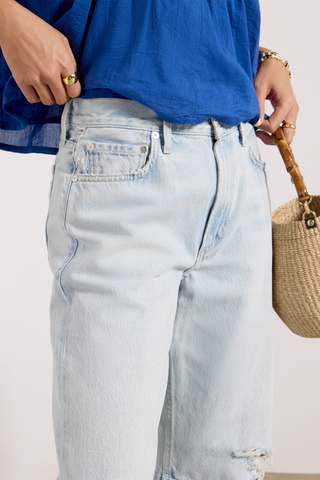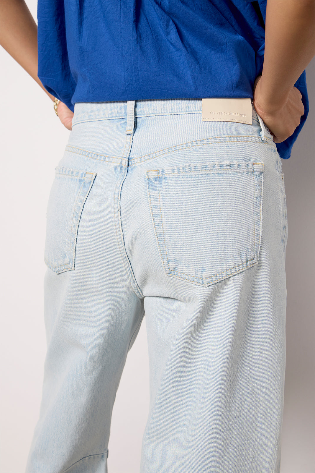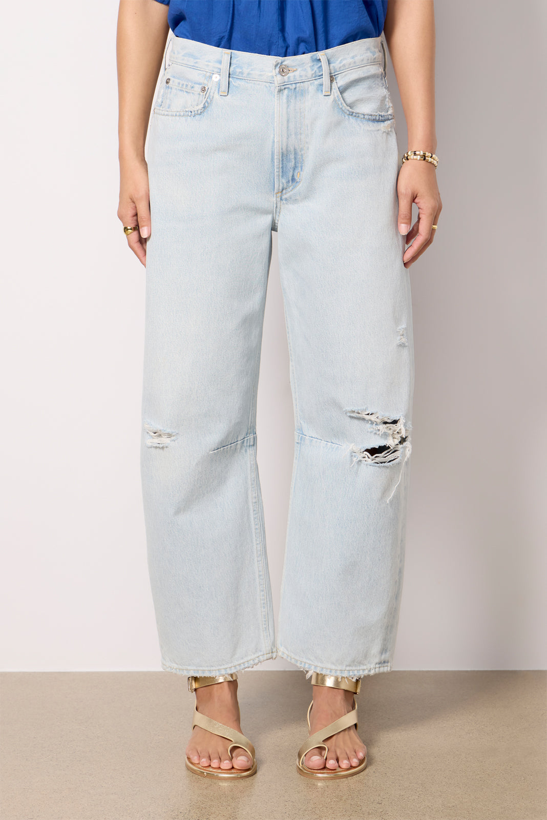 Distressed details add a lived-in feel to these?light-wash barrel jeans by Citizens of Humanity. Finished in rigid cotton denim. the Miro features a relaxed silhouette with a tapered. bowed leg. high-rise waist. and ankle-length hems.