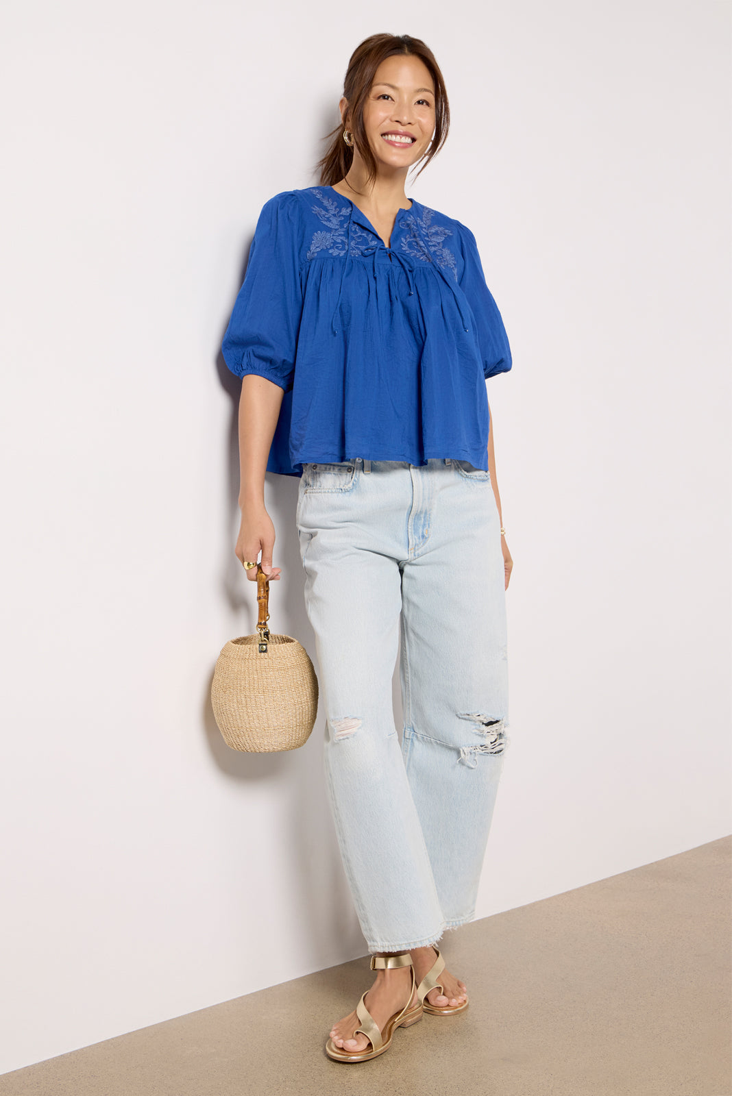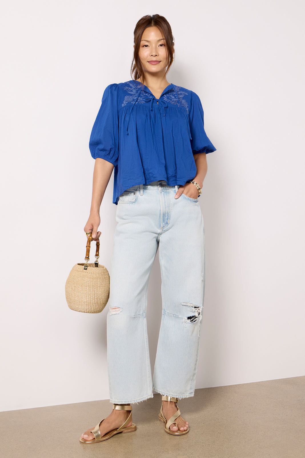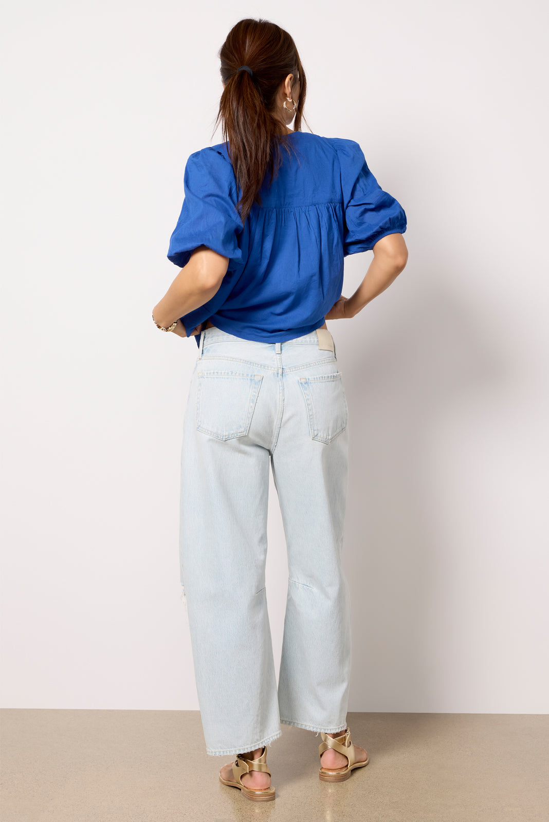 Distressed details add a lived-in feel to these?light-wash barrel jeans by Citizens of Humanity. Finished in rigid cotton denim. the Miro features a relaxed silhouette with a tapered. bowed leg. high-rise waist. and ankle-length hems.