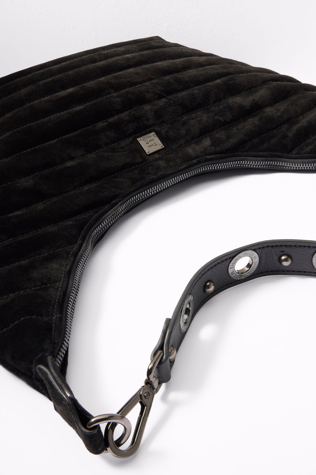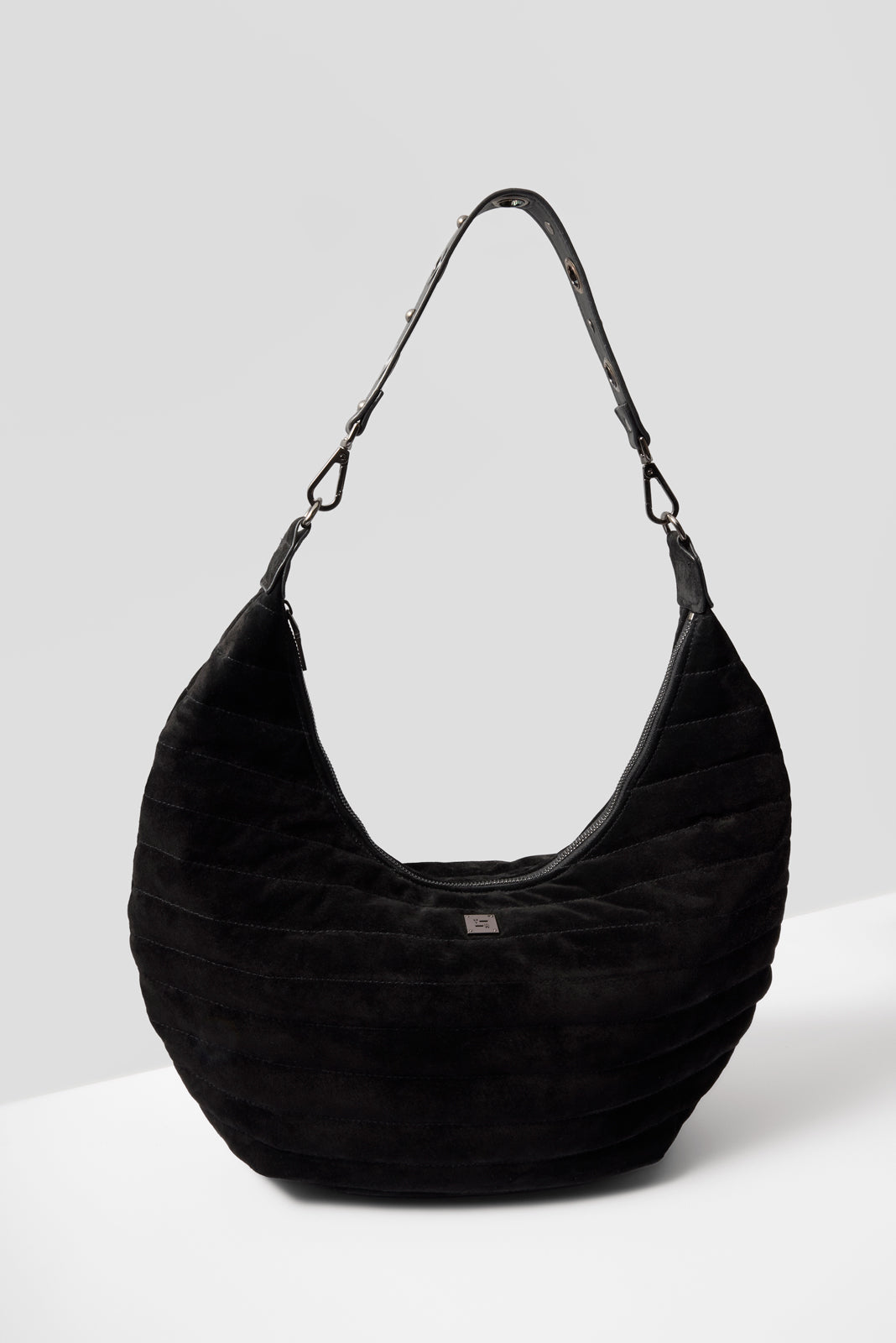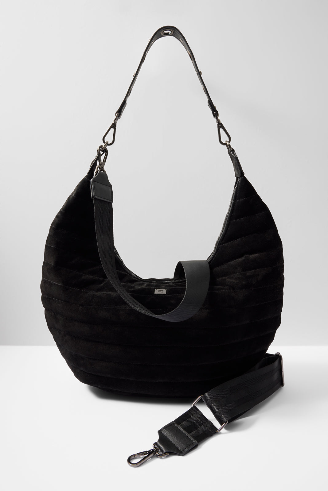 Soft black suede makes the Moonstruck Hobo Bag by Think Royln the perfect night out accessory. featuring a top zip closure and two detachable strap options??a grommet strap to wear on the shoulder or an adjustable crossbody strap to go hands-free.