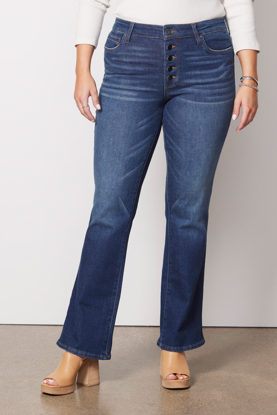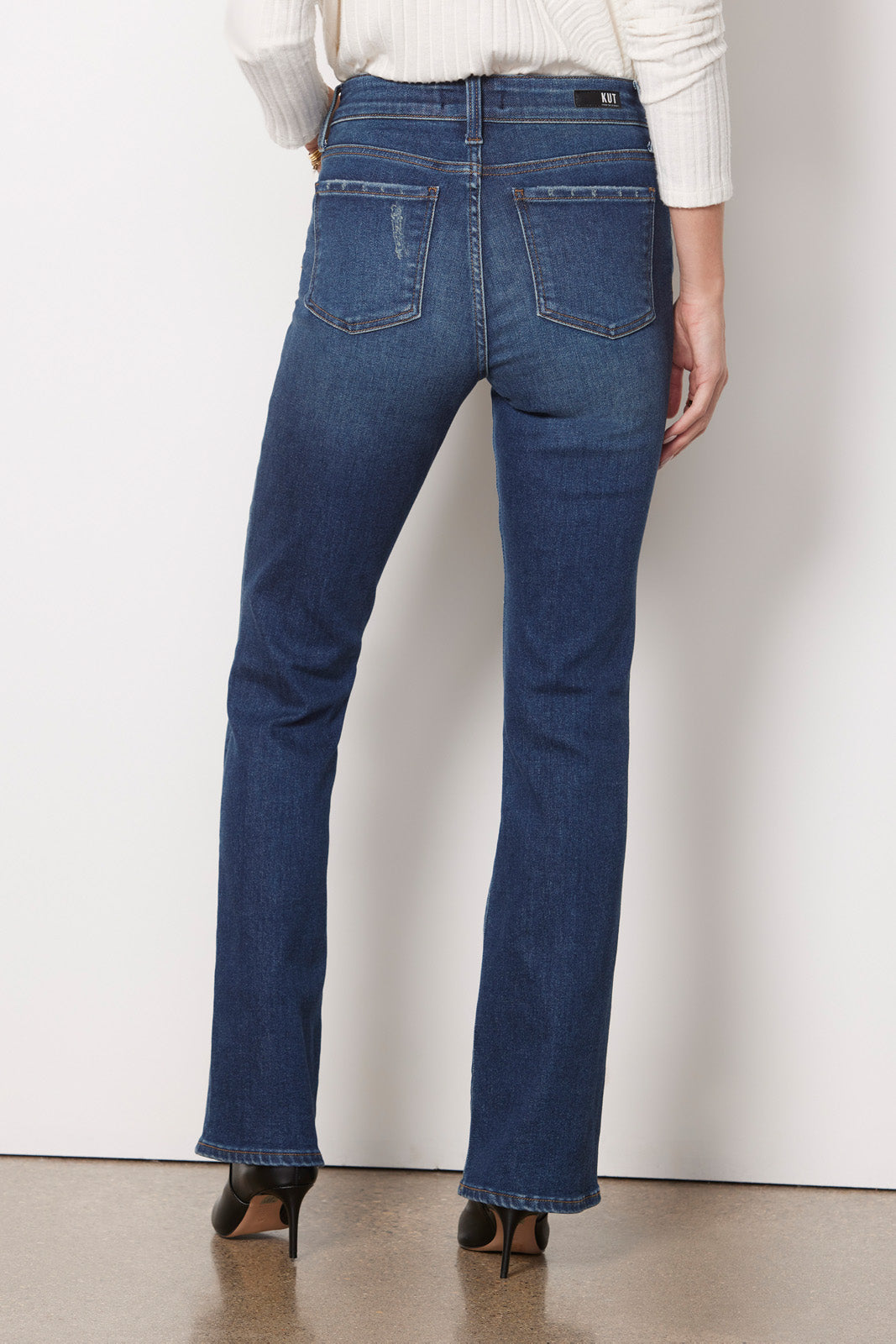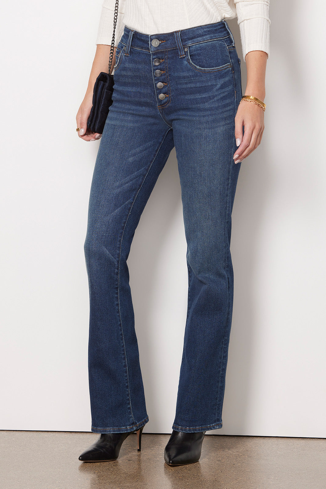 Go from day to night in these versatile bootcut jeans by Kut From The Kloth. A high rise and full-length inseam create this ultra-flattering silhouette featuring an exposed button fly. gently flared leg. and comfort-stretch denim fabric.