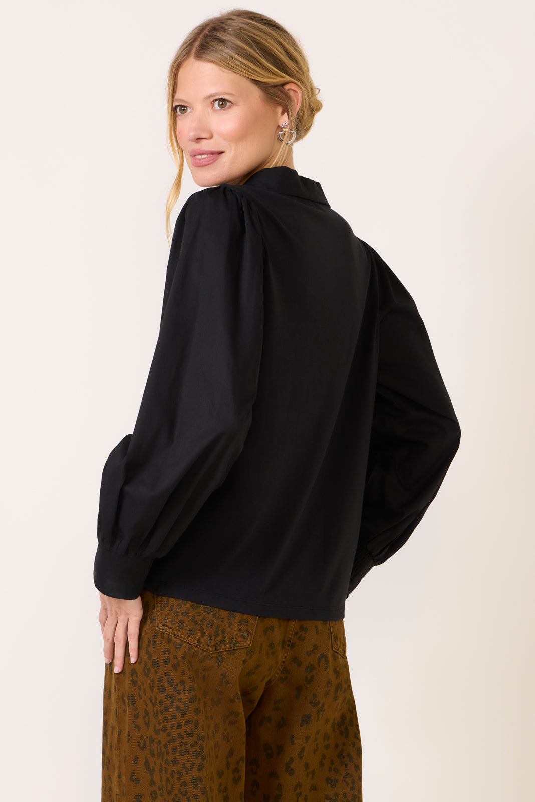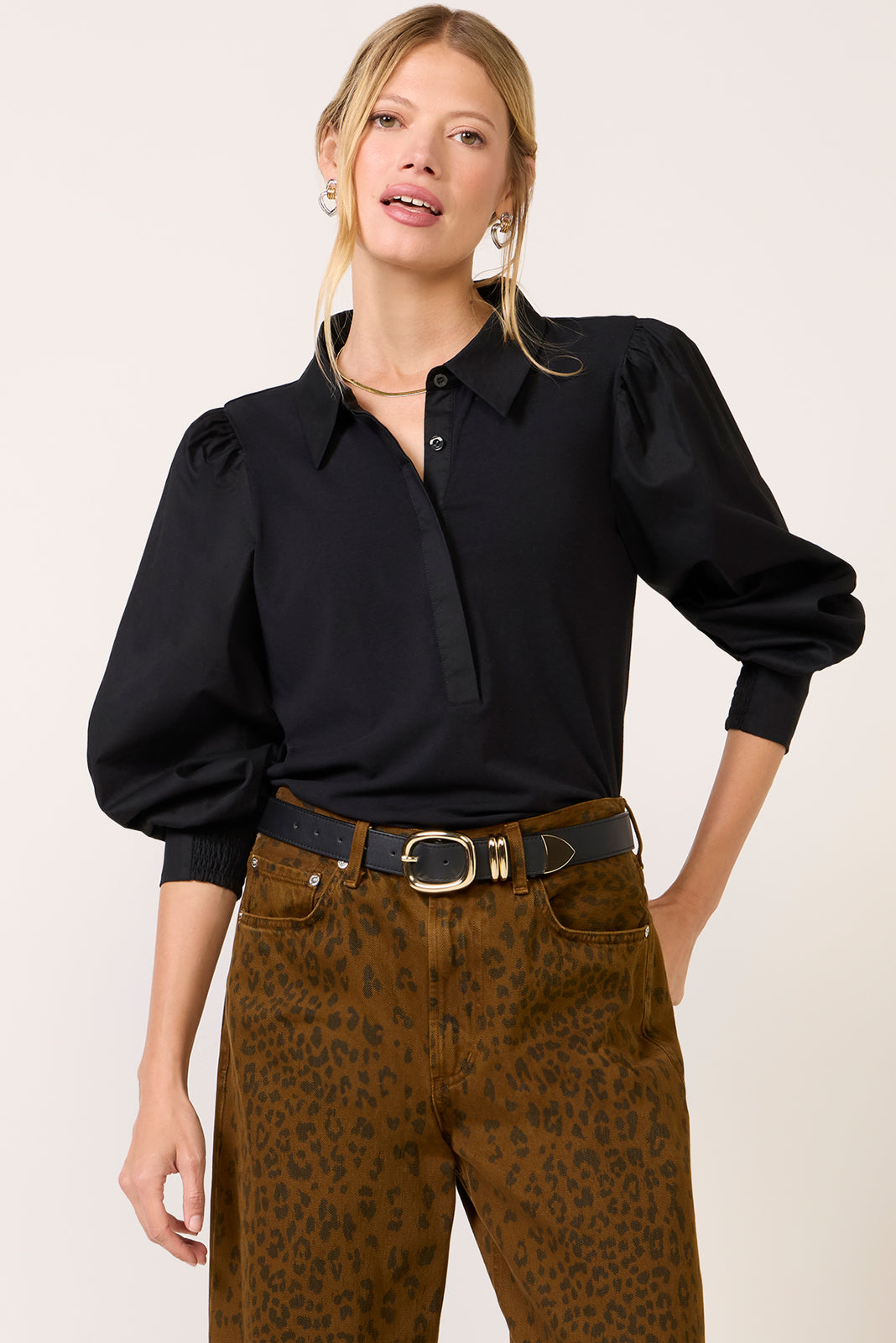 Upgrade your workwear wardrobe with the Nelly Mixed Media Top by EVEREVE. featuring a classic collar. half front button placket. long sleeves with gathering at the shoulders. and smocking details at the cuffs.?