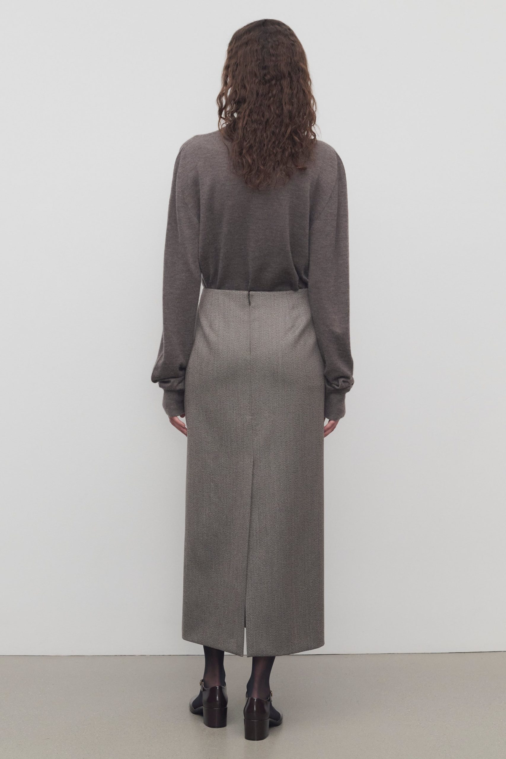Ankle-length pencil skirt in sleek virgin wool gabardine with center back slit and concealed center back zip closure.