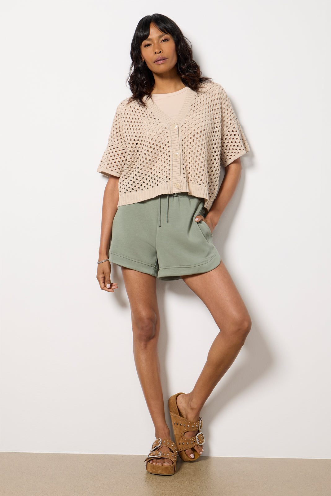 Crafted in their signature DoubleSoft fabric. the Ollie Short by Varley features a high-rise fit. an elastic waist with an adjustable drawstring. and a shaped hem.