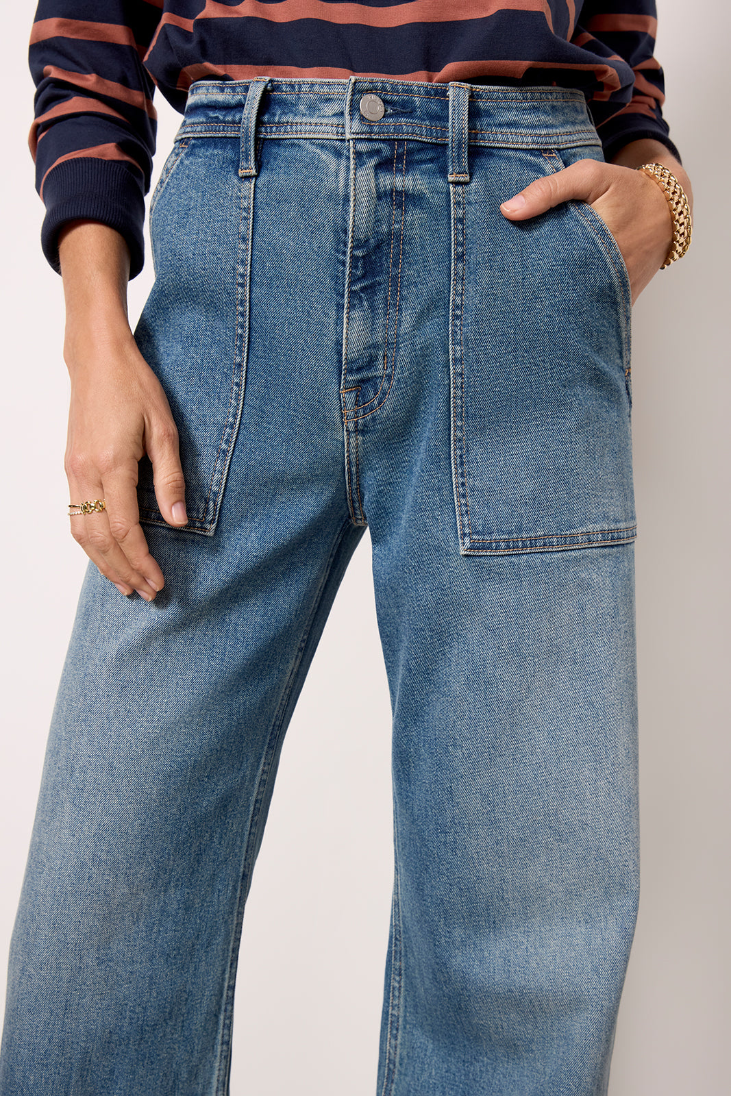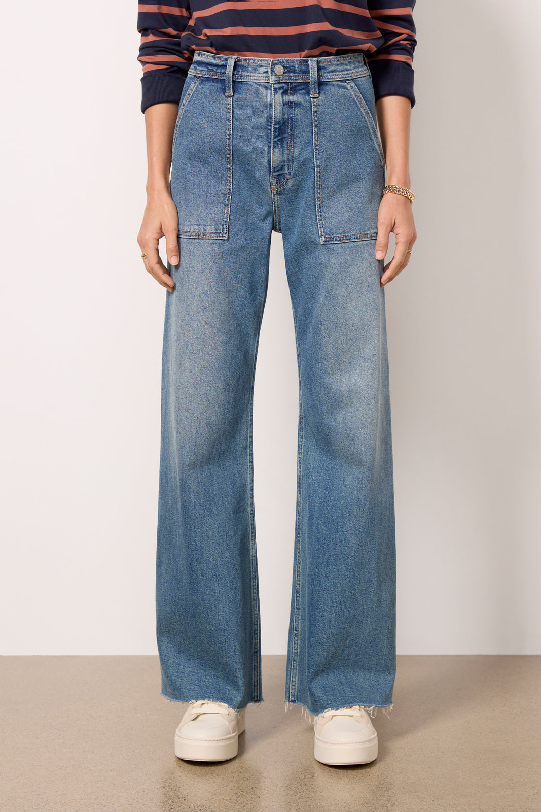 Perfect for day-to-night wear. the Penny wide leg jean by Pistola features a high-rise waist. raw hems. and?front patch pockets for a hint of utility-inspired style.