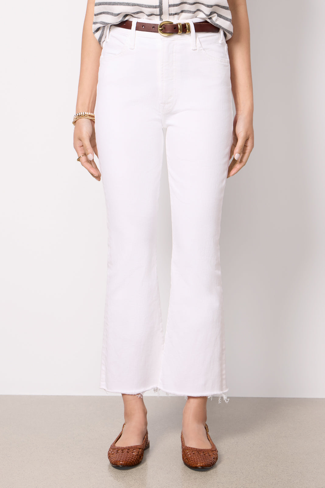 The Lil Hustler Ankle Fray jean by MOTHER is a petite flare silhouette. featuring an ankle-length inseam. raw hems. and soft stretch denim in a bright white wash. Designed to complement petite body types. these jeans feature a higher knee placement. shorter inseam. and shorter rise for a perfect. always-flattering fit.