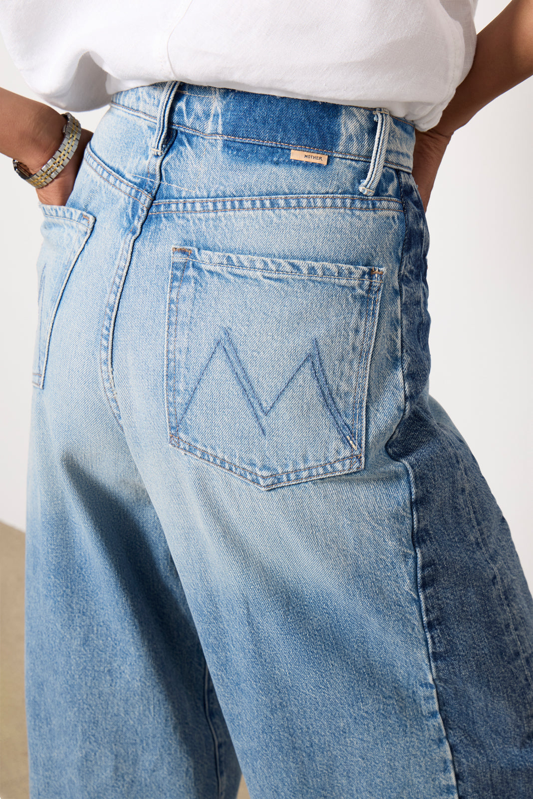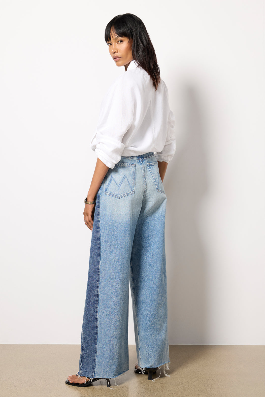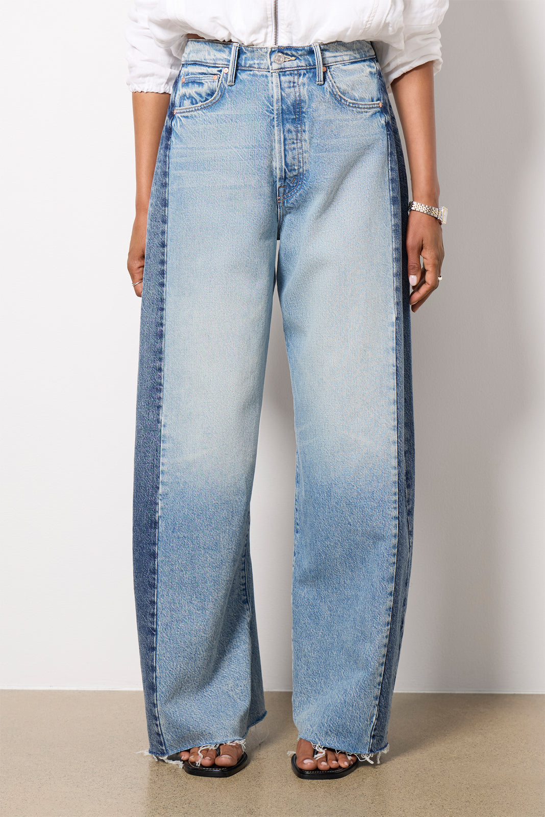 Designed with contrasting side panels. these stylish wide leg jeans by MOTHER are crafted from non-stretch cotton denim and feature a relaxed silhouette with a high-rise waist. 32 inseam. and raw hems.