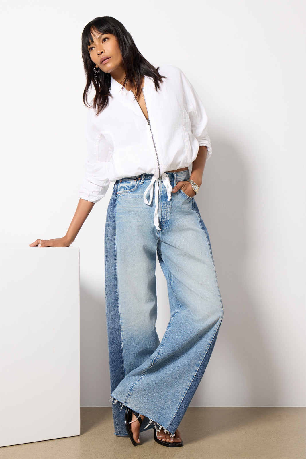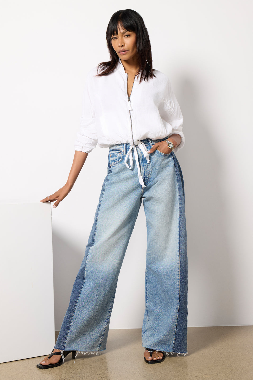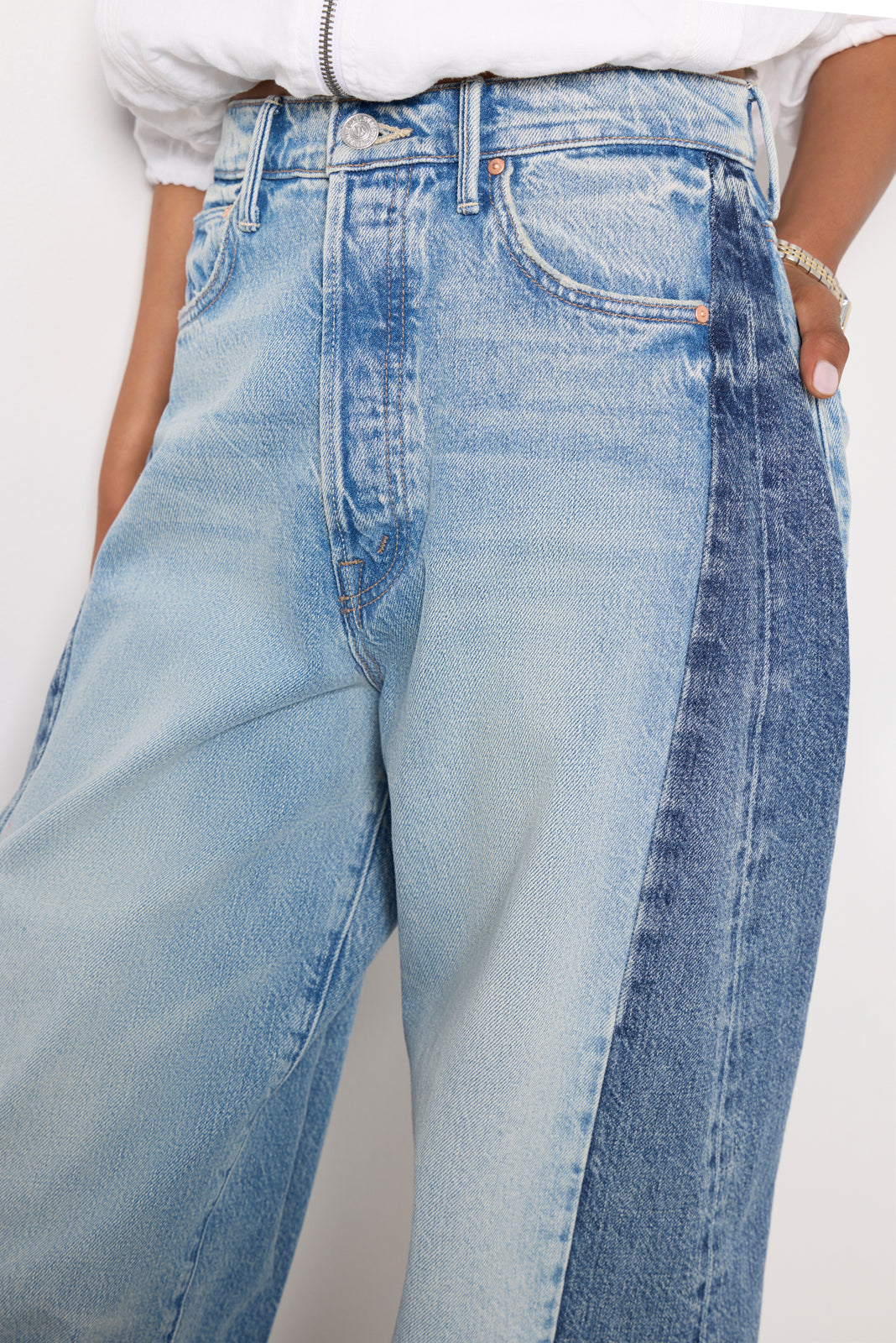 Designed with contrasting side panels. these stylish wide leg jeans by MOTHER are crafted from non-stretch cotton denim and feature a relaxed silhouette with a high-rise waist. 32 inseam. and raw hems.