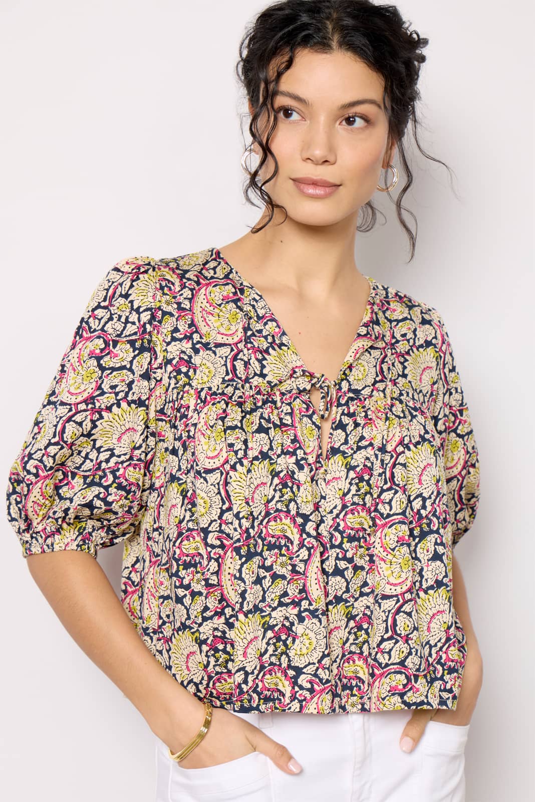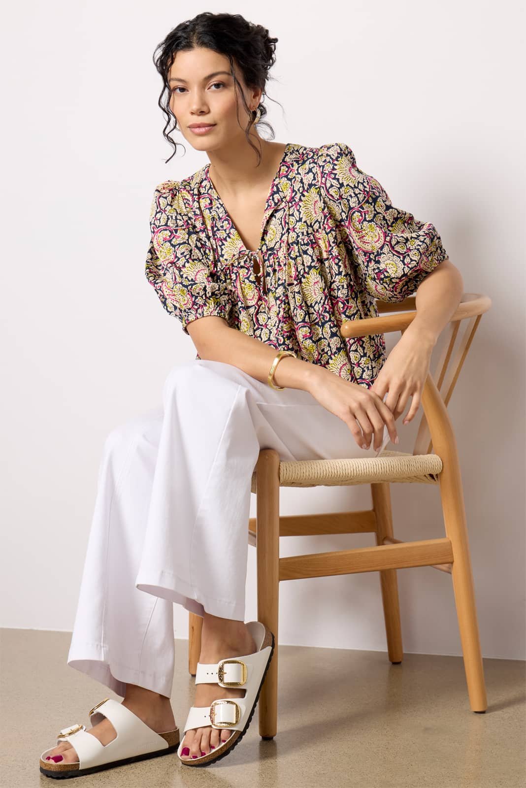 Flowy. feminine. and perfect for your spring rotation. Crafted in organic cotton. this?printed?top by Emerson Fry features elbow-length puff sleeves and a v-neckline with double ties.