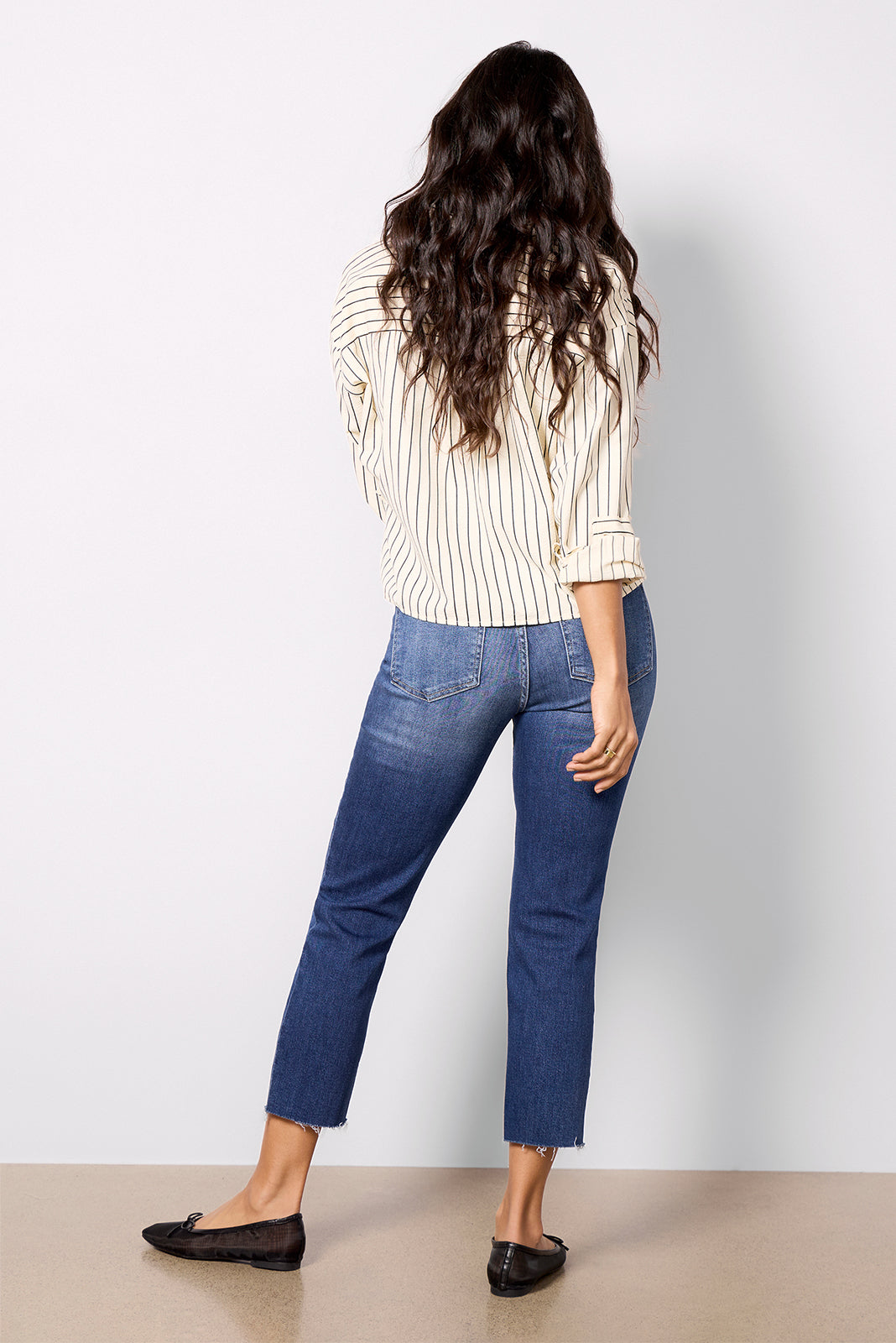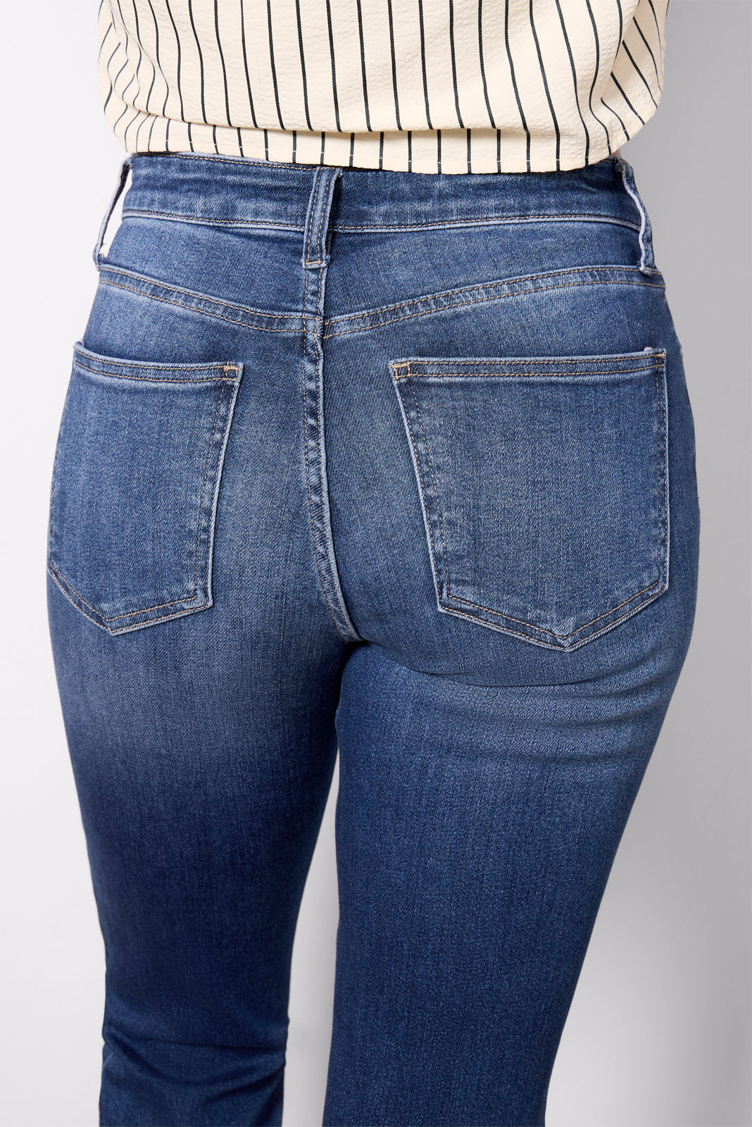 Top off your denim collection with the Rachael jean by KUT From The Kloth. Crafted in comfort-stretch denim. these versatile jeans feature a slim straight leg. faded blue wash. and ankle-length raw hems.