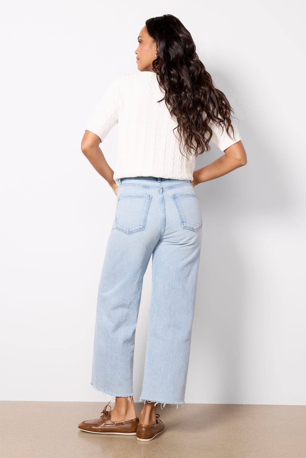 Crafted in soft. sustainable denim fabric. the Ren Jean by AGOLDE features a wide leg silhouette with a high-rise waist and ankle-length raw hems. The versatile light wash makes them perfect for day-to-night wear.