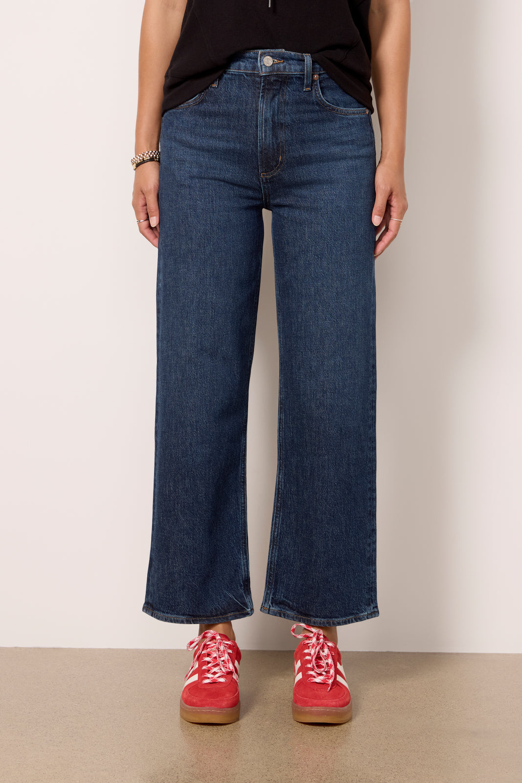 Crafted in soft. sustainable denim fabric. the Ren?jean by AGOLDE features a wide leg silhouette with a high-rise waist and clean ankle-length hems. The?dark wash makes them perfect for day-to-night wear with tees. tanks. and blouses.