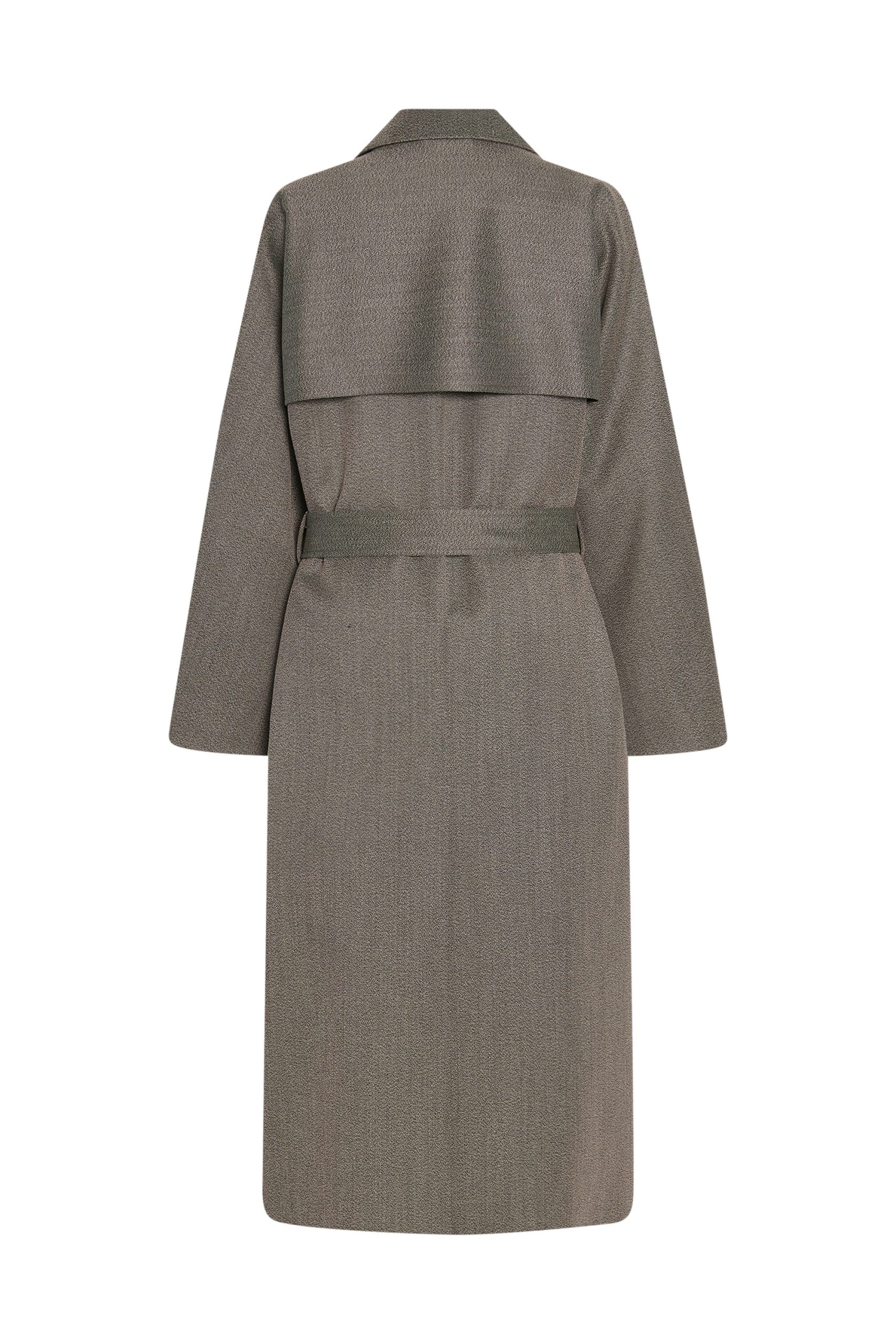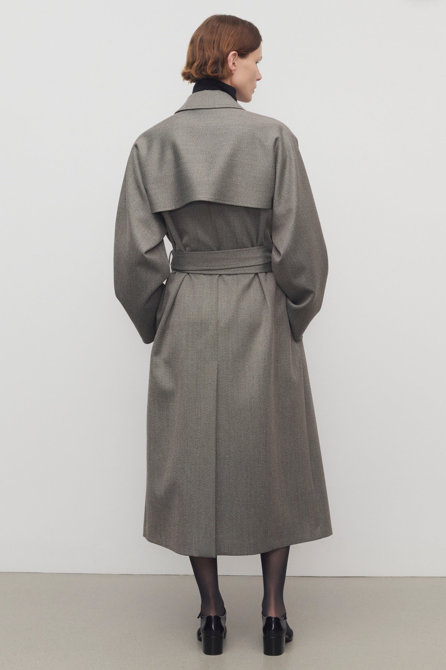 Oversized double-breasted trench coat in sleek virgin wool gabardine with slant welt pockets. horn button closure. and removable belt with buckle.