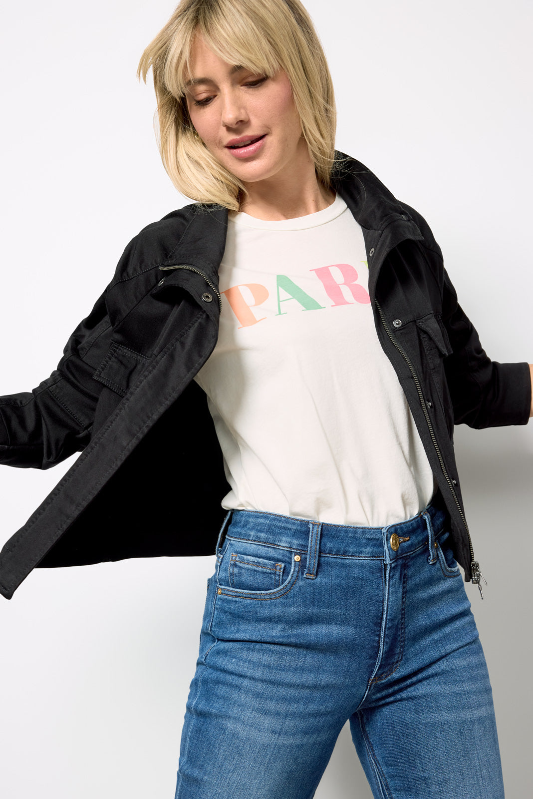 Elevate your everyday layering collection with the Rocky jacket by EVEREVE. Topped with utility-style chest pockets. this easy-to-love jacket features a cropped length. front zipper and snap closures. and seamed long sleeves.