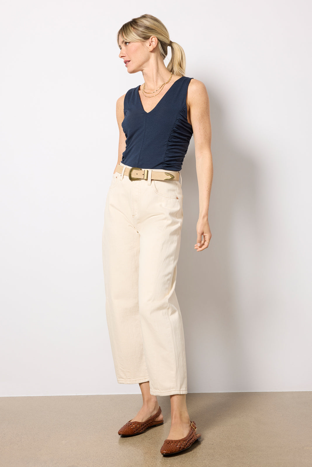 Ruched side panels define the flattering Shawna tank top by Nation LTD. featuring a fitted silhouette. v-neckline. and soft Pima cotton-blend fabric.