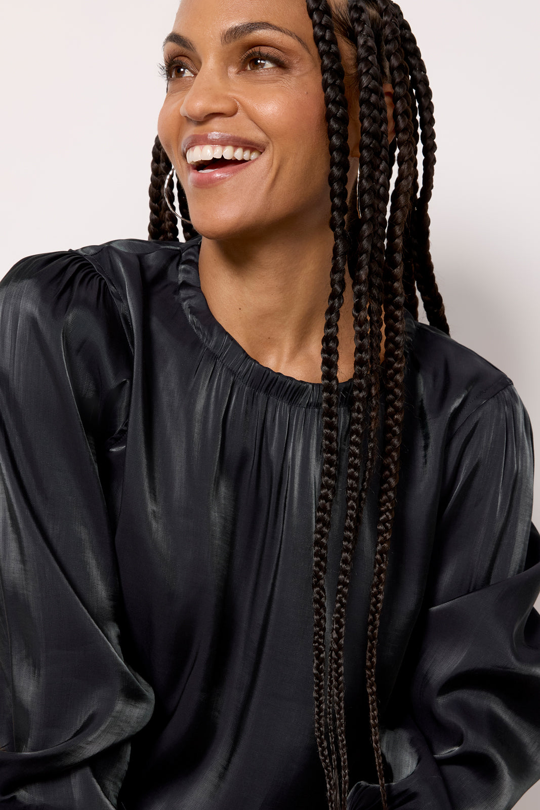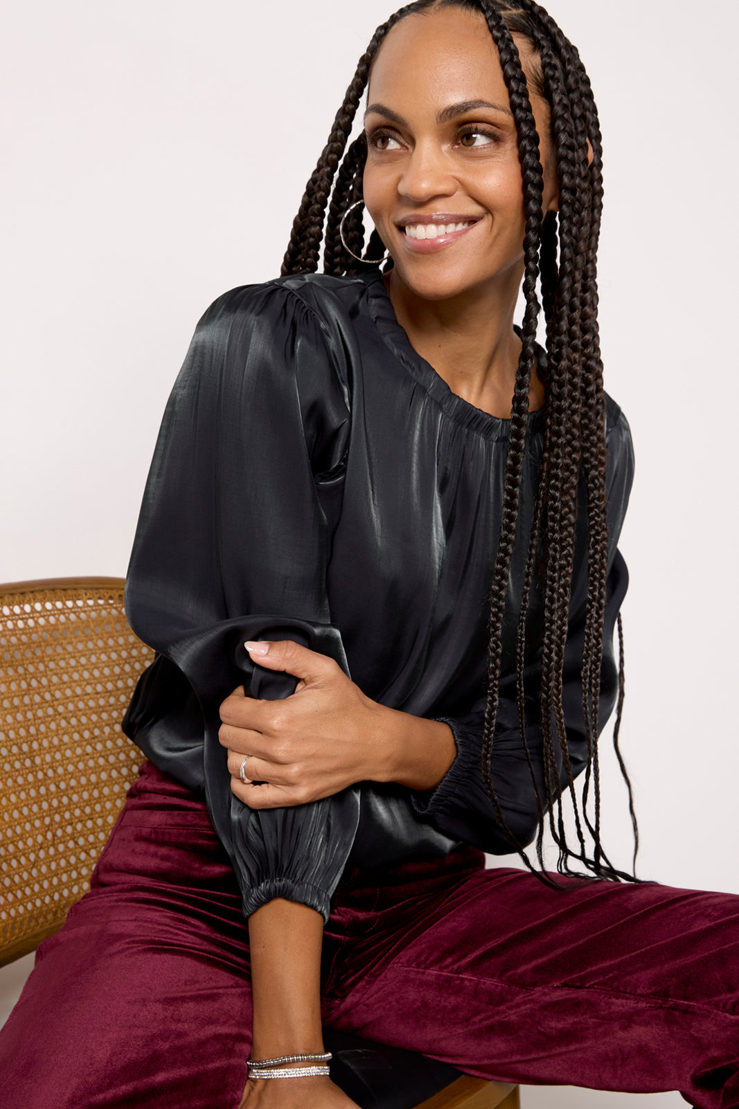 Finished in shimmery woven fabric. this chic Cloth & Stone blouse features a shirred neckline. long puff sleeves. and elastic at the collar. cuffs. and hem. Style for a night-out occasion with velvet pants and mules.