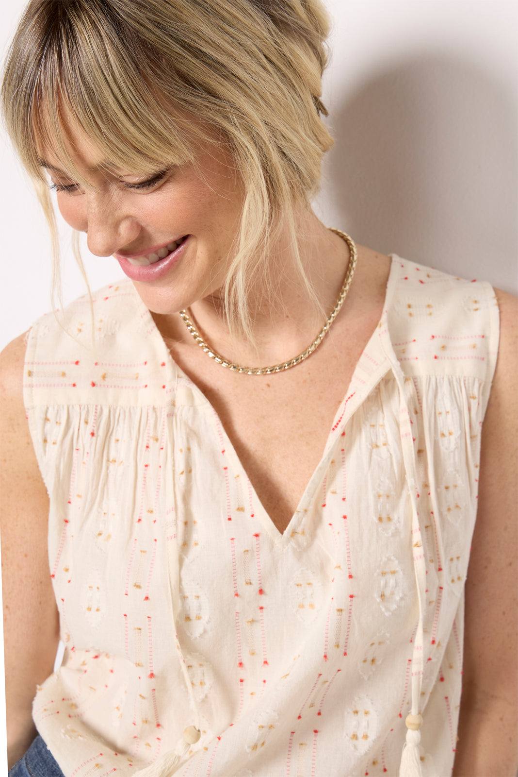 Elevate your warm-weather collection with the Skylar Top by Faherty. Finished in textured organic cotton-blend fabric. this sleeveless top features a relaxed fit. shirred yoke. and tassel ties at the neckline for a playful touch.
