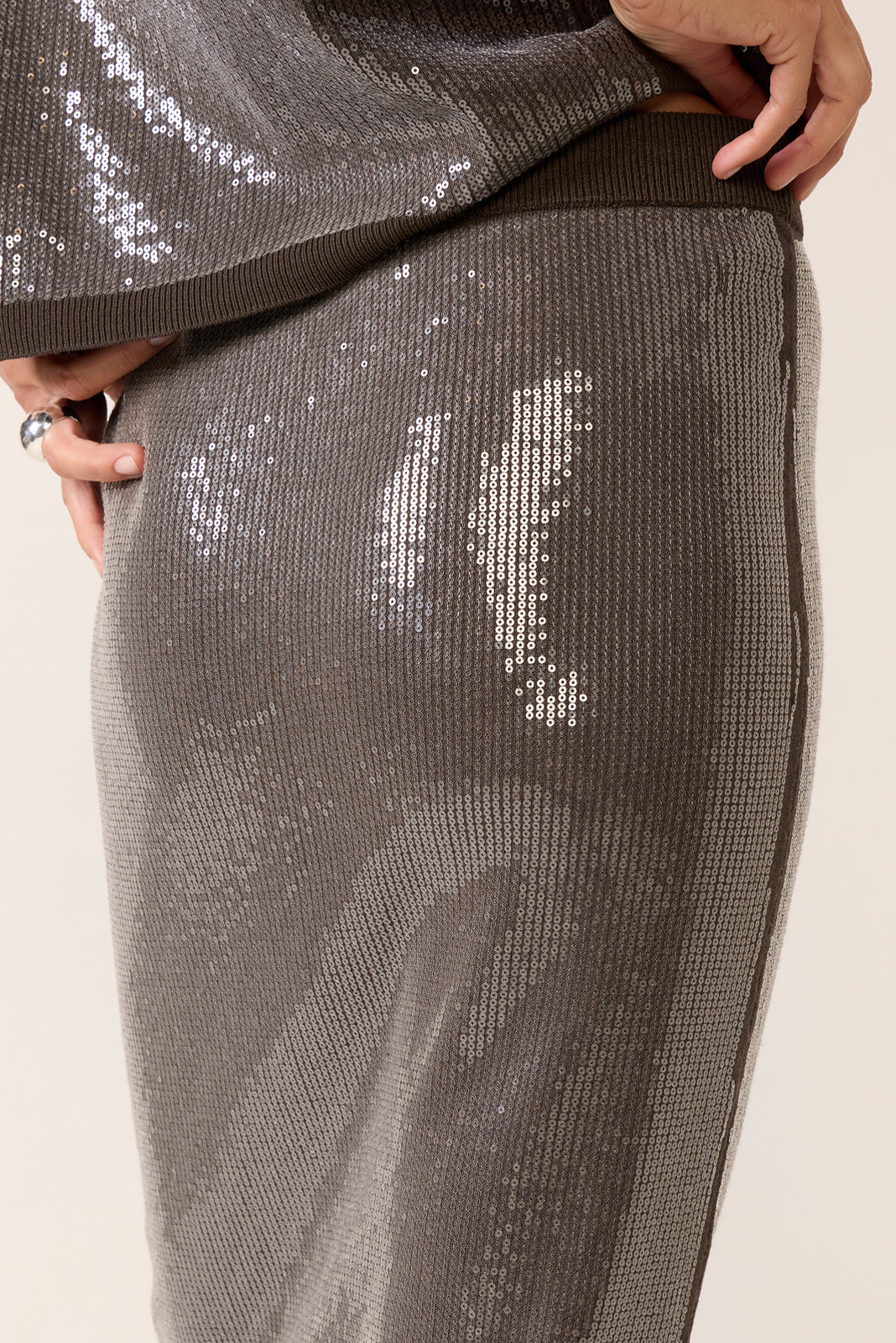 Sparkle and shine in this sequin midi pencil skirt by Sanctuary. crafted in a fine gauge sweater knit with an elastic waist and ribbed trim. Make it a stylish two-piece set with the matching Sparkle Sequin Sweater.