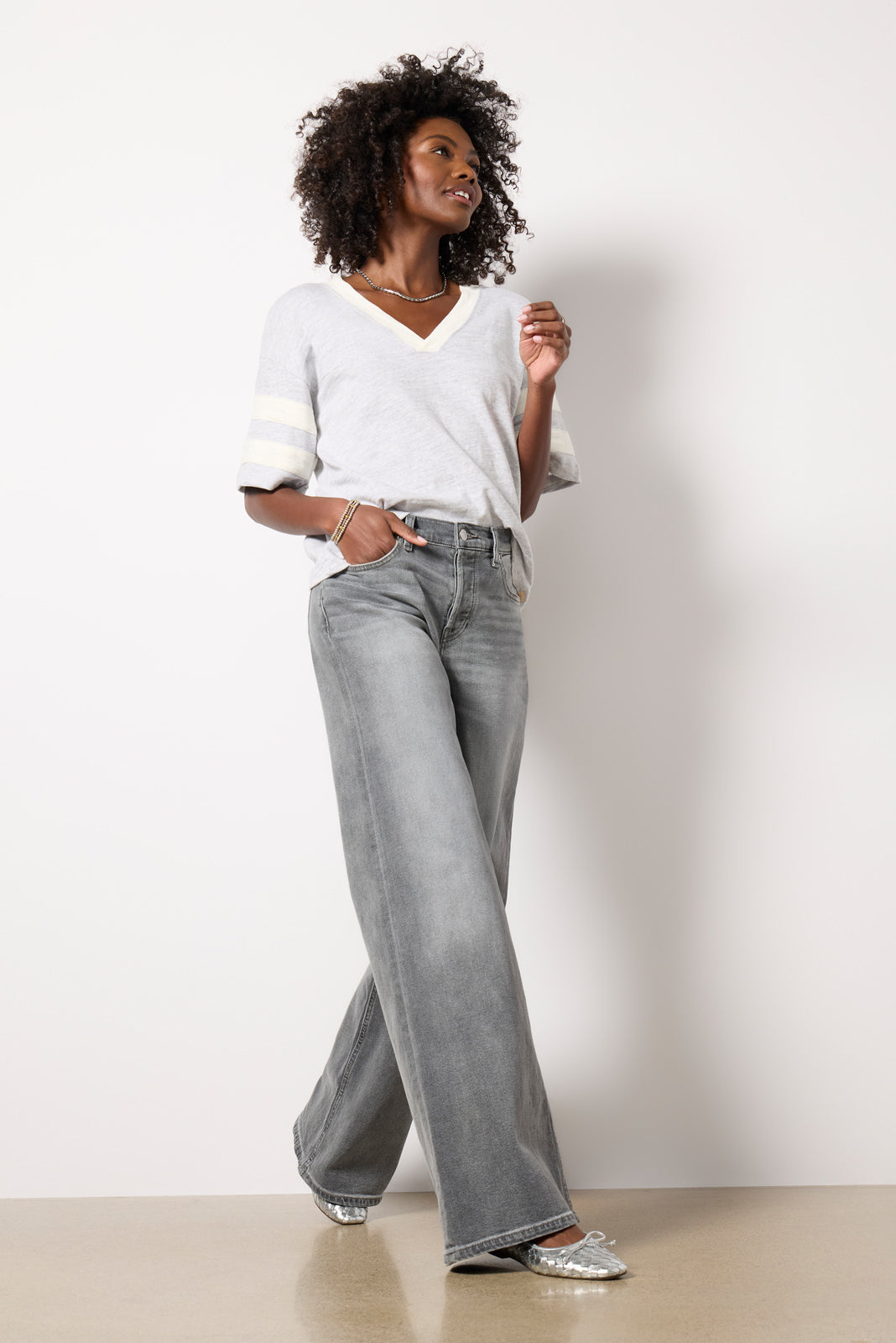Lean into sporty style this season with this varsity tee by Faherty. featuring a v-neckline. striped short sleeves. and soft organic cotton fabric.